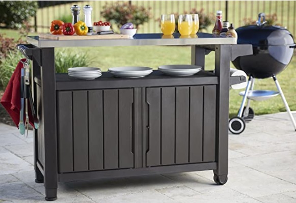 This table, with storage cabinets underneath, can serve as an outdoor kitchen island or as a bar cart for weekend parties. You can purchase this product right here.