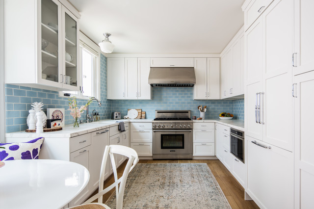 The perfect layout for a larger kitchen, the U-Shape configuration incorporates cabinets on three adjacent walls and provides plenty of storage for the families that love to cook at home. To mix up this layout, and provide a break in the monotony, try to have upper cabinets for two of the three walls, and on the third wall try to implement open shelving or a focal point that stands out. This configuration is perfect for workflow and allows for more than one cook in the kitchen.