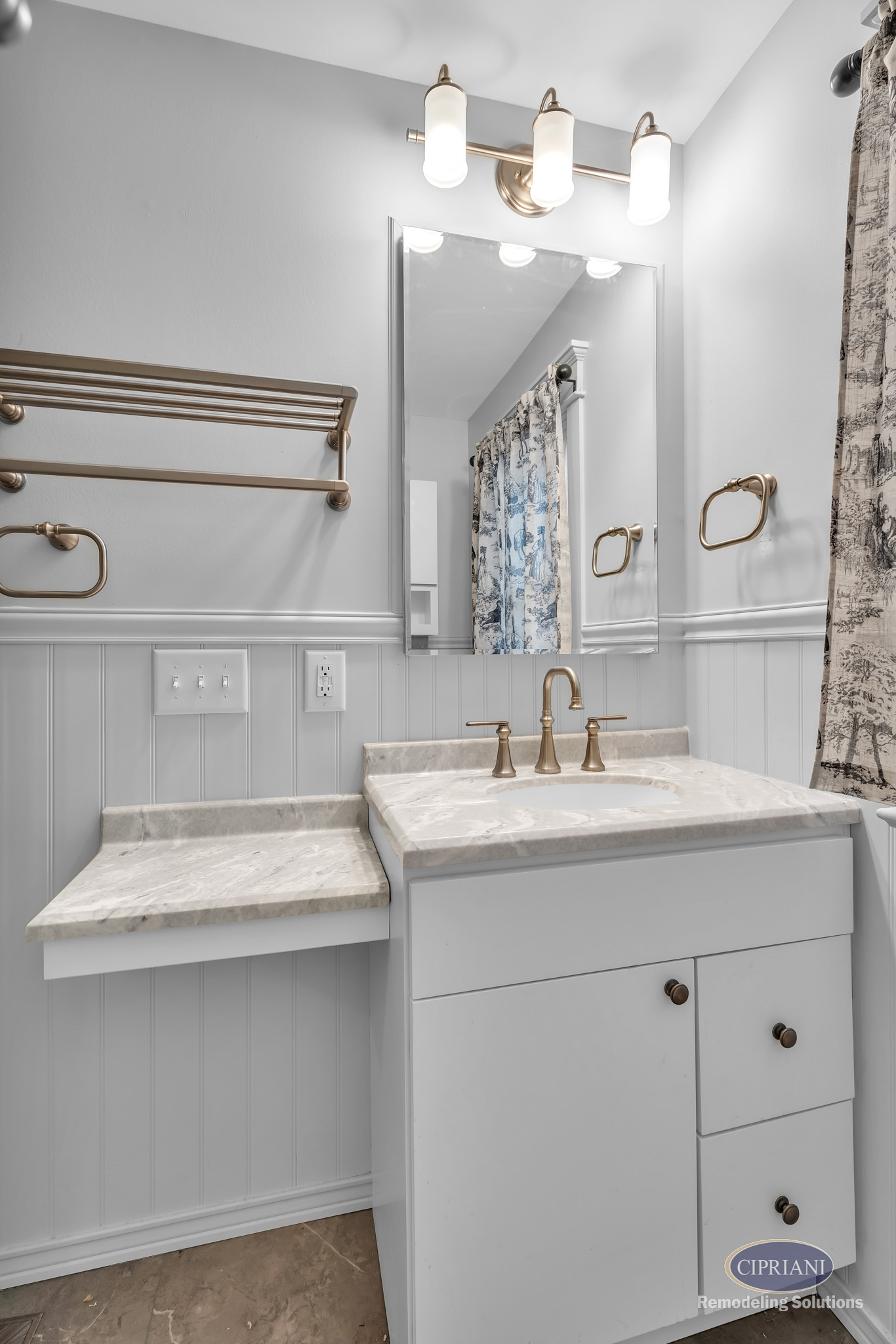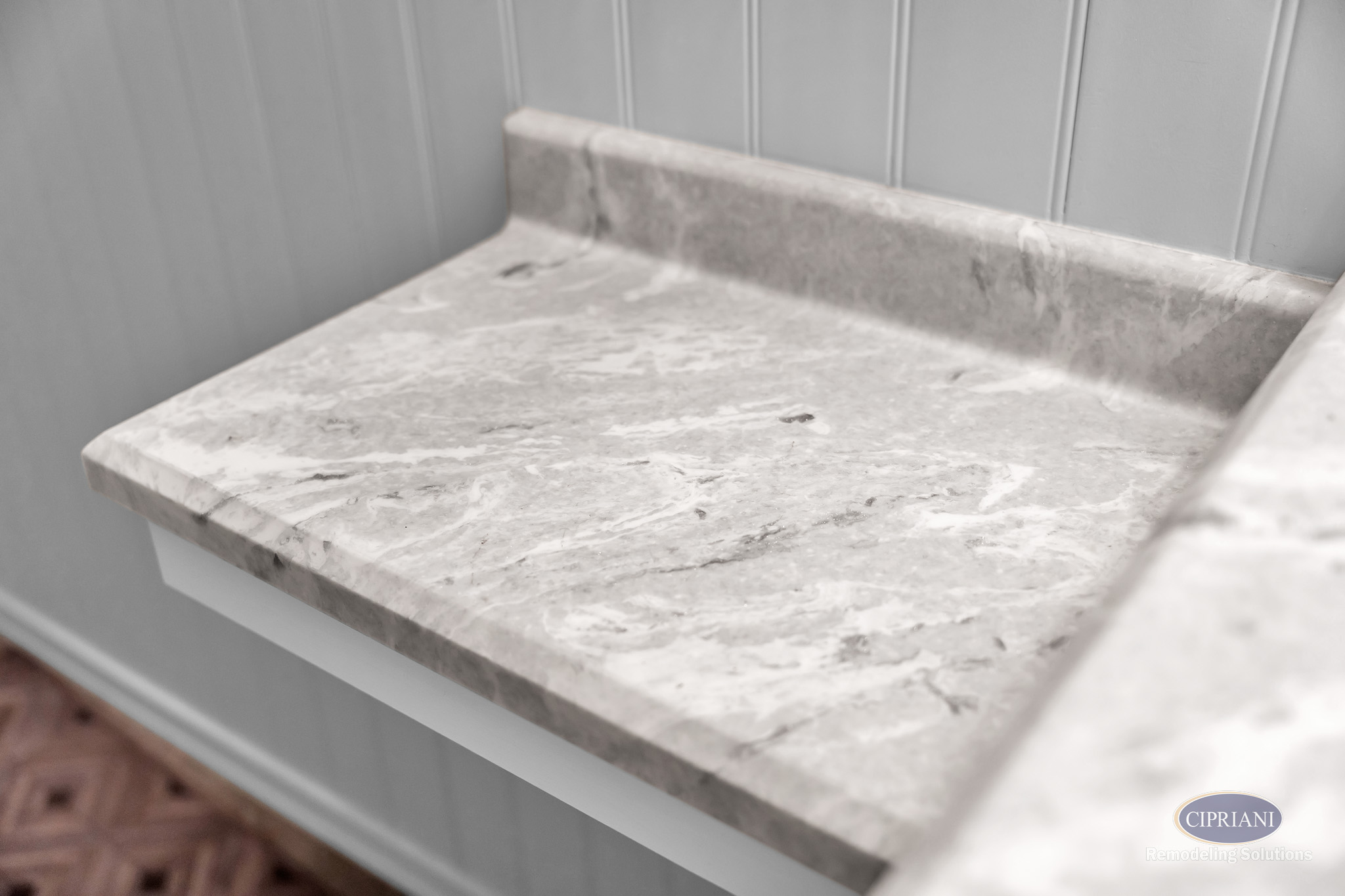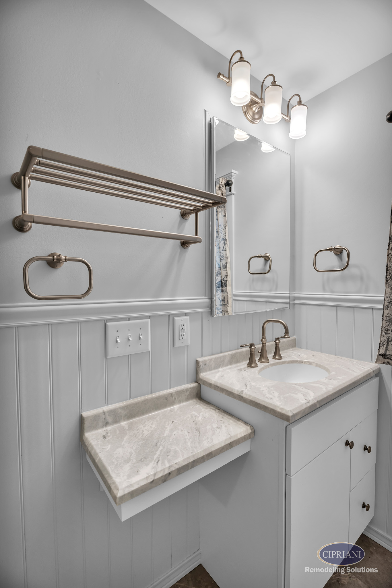 Custom Vanity with Side Ledge: Integrated countertop and added surface space provide both function and a tailored fit.