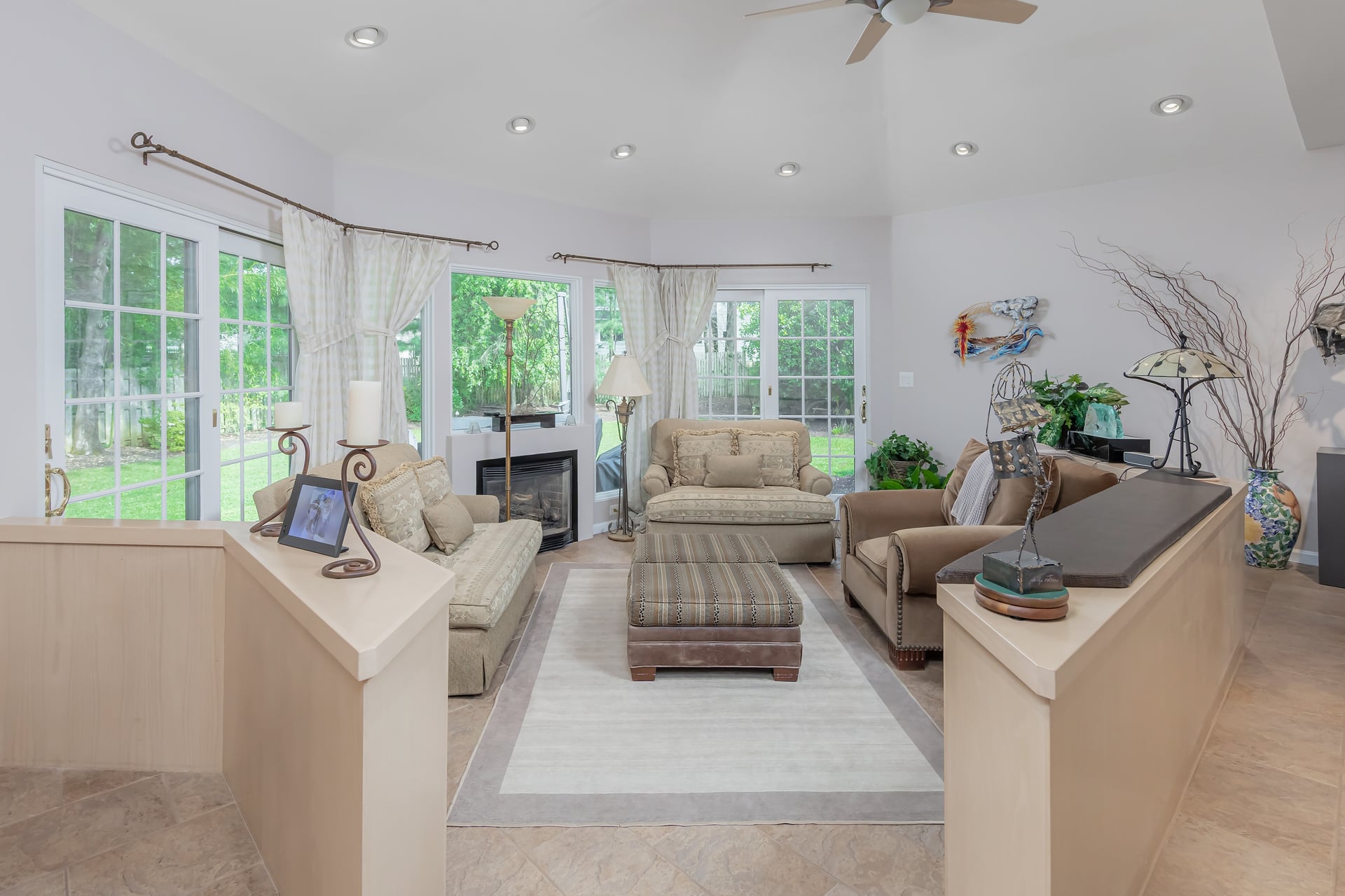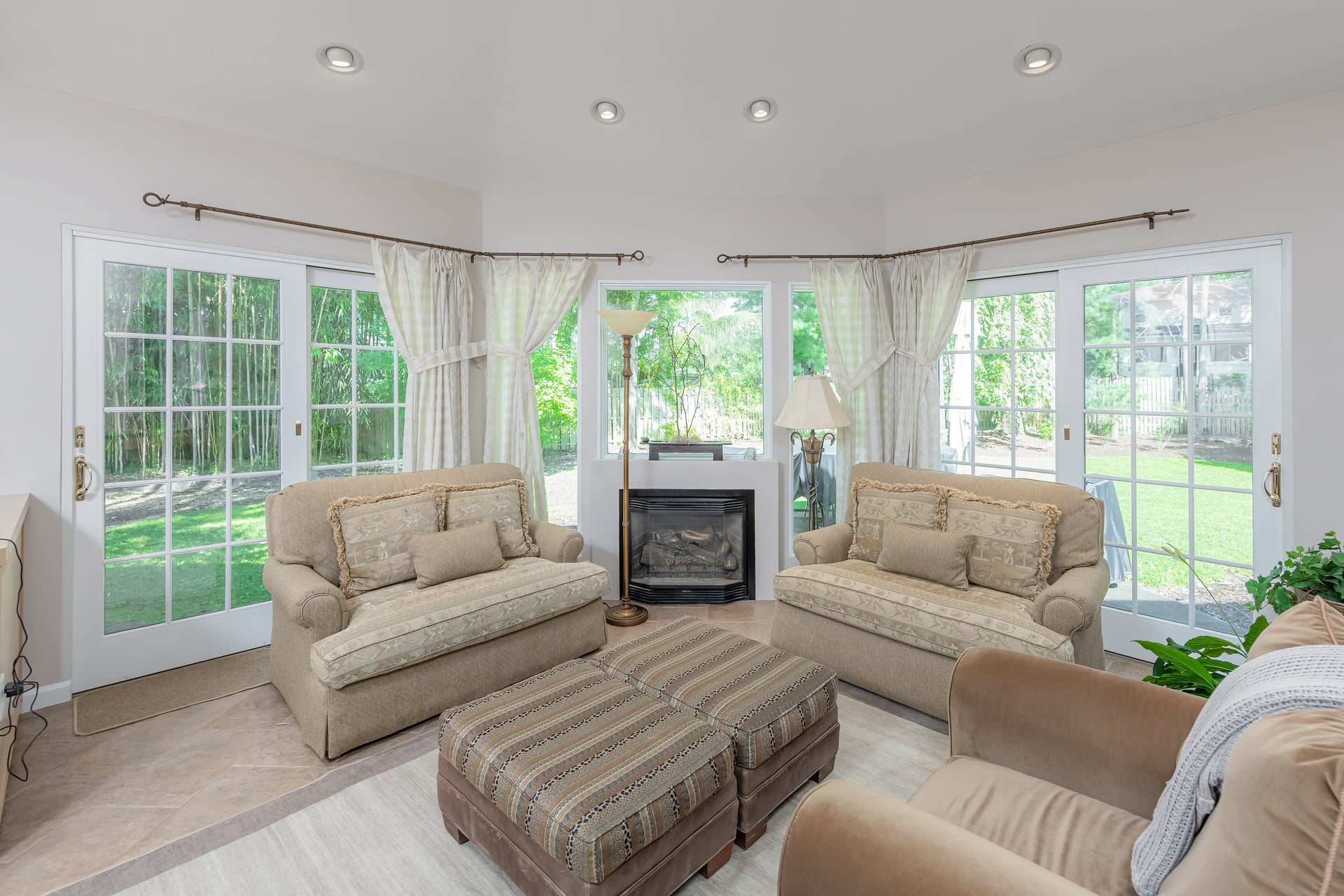Fireplace Sitting Area: Cozy focal point filled with natural light.