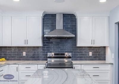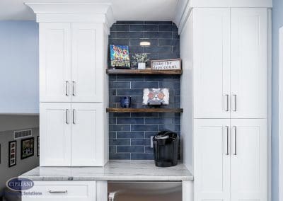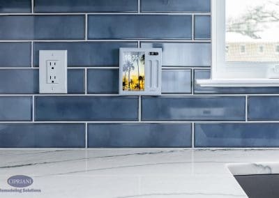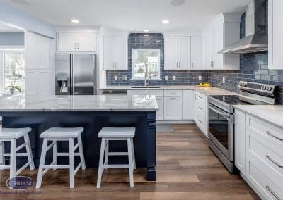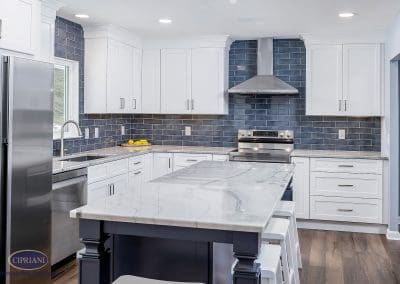 We chose quartzite countertops for their durability and elegance. The natural stone provided a stunning accent around the white cabinetry, creating an appealing contrast. The vibrant blue island introduced a pop of color and personality to the space – adding to the kitchen’s aesthetic appeal as well as offering additional storage and seating options.