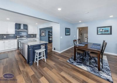 Achieving this vision required a bold design choice – relocating the kitchen to the existing dining room area. This strategic shift allowed us to remove the wall separating the two spaces and create one large, cohesive room. This created a sense of openness and connectivity, making the kitchen not just a place for cooking but a central hub for family gatherings and entertainment.