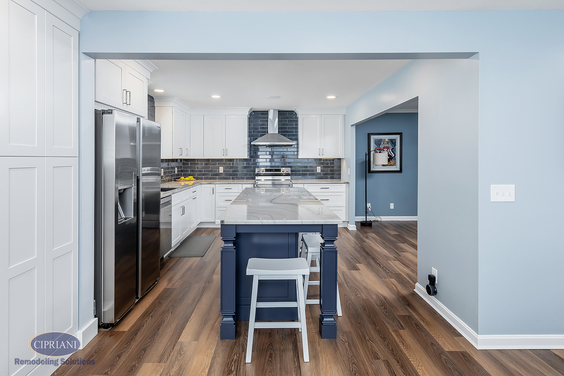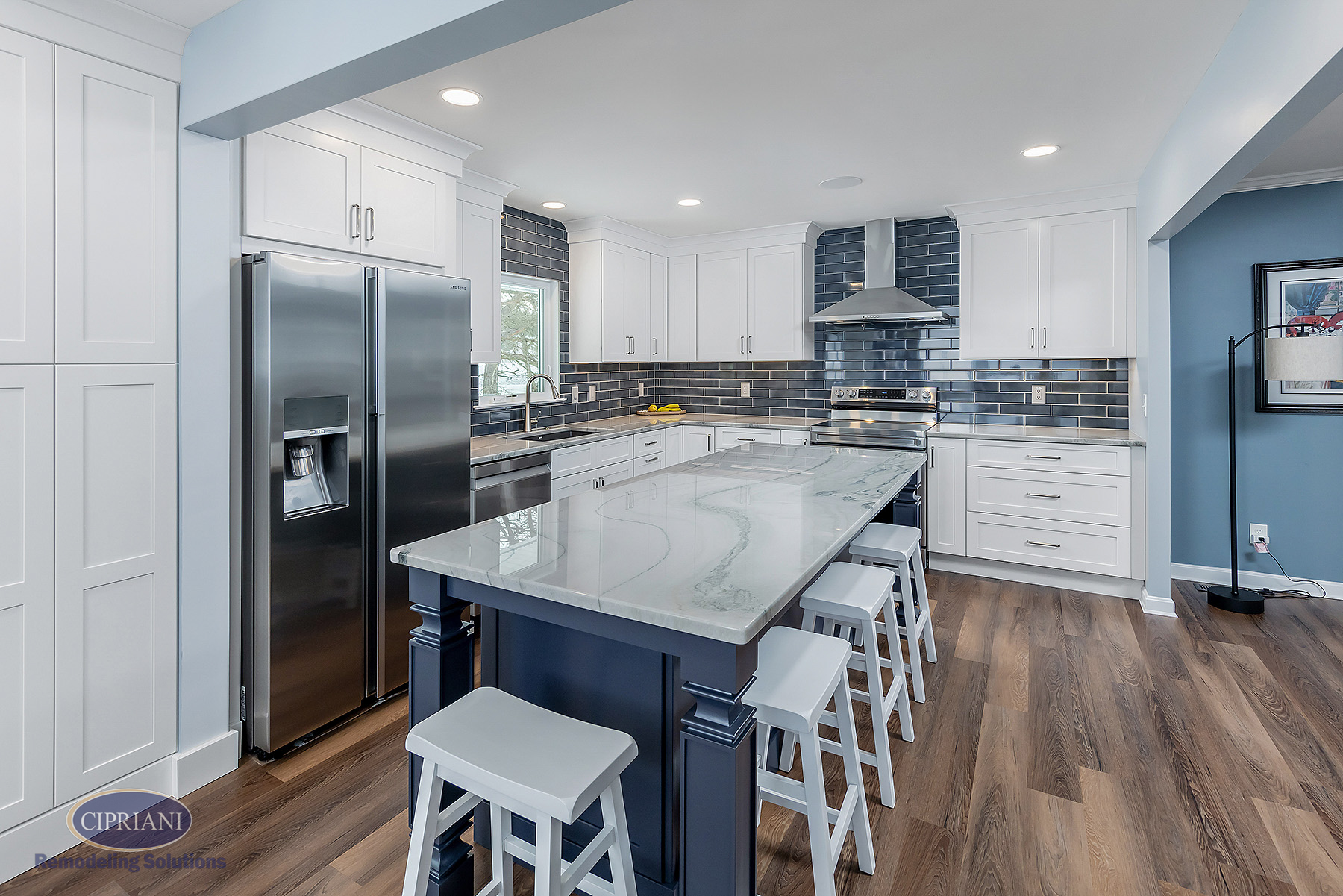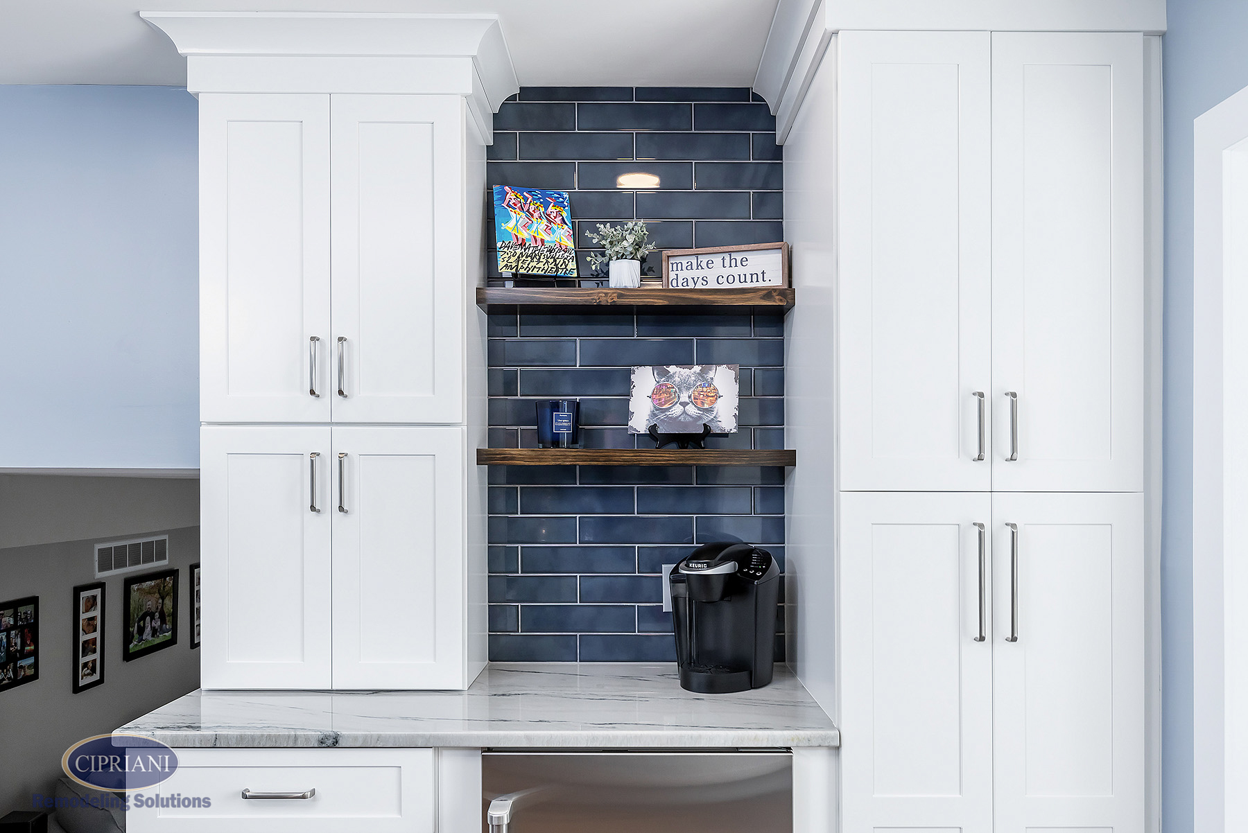 We chose quartzite countertops for their durability and elegance. The natural stone provided a stunning accent around the white cabinetry, creating an appealing contrast. The vibrant blue island introduced a pop of color and personality to the space – adding to the kitchen’s aesthetic appeal as well as offering additional storage and seating options.