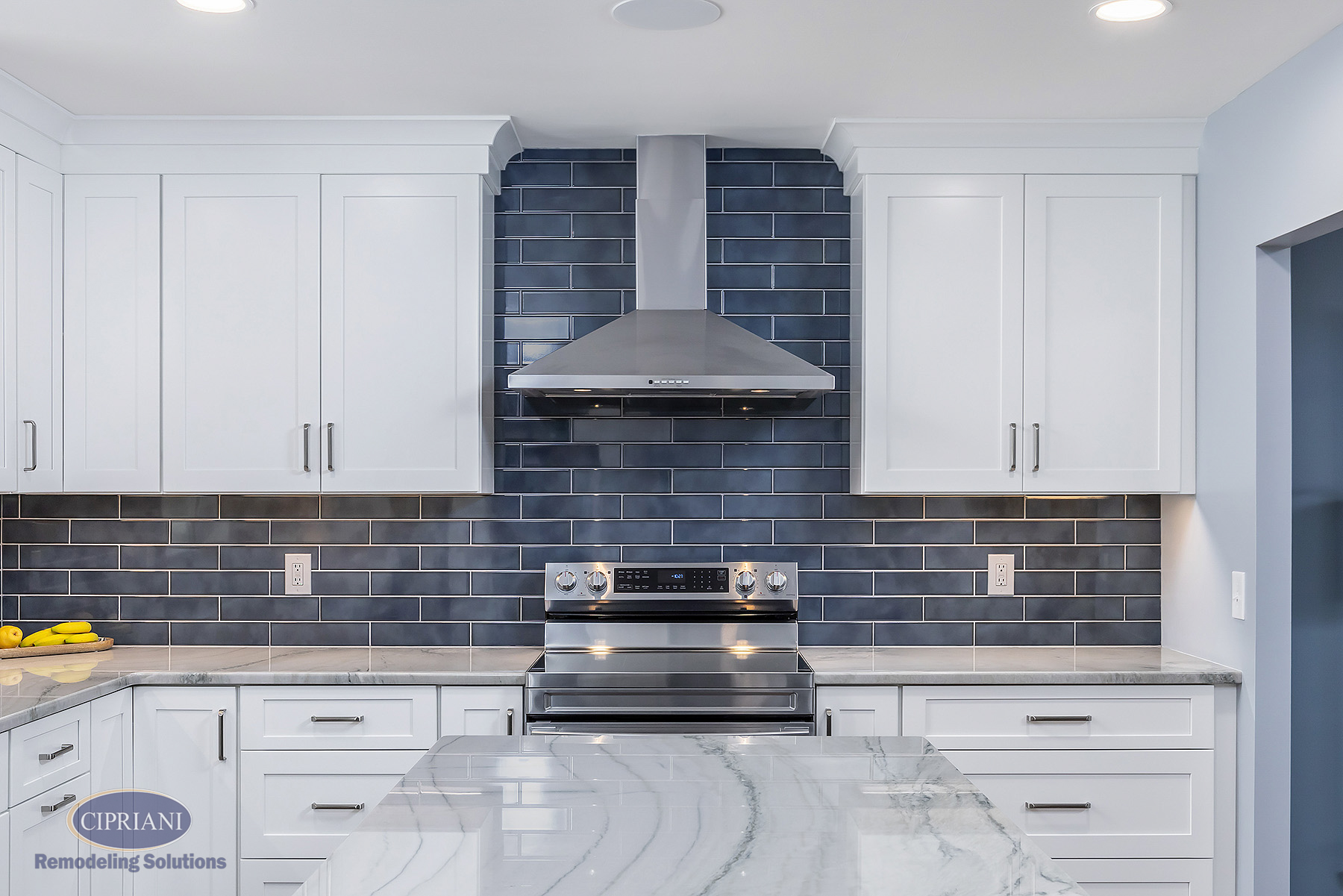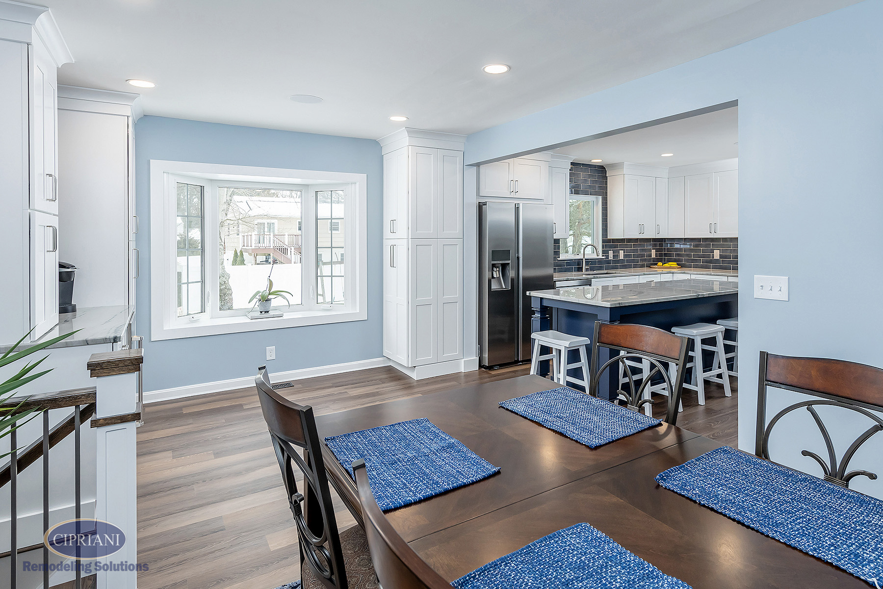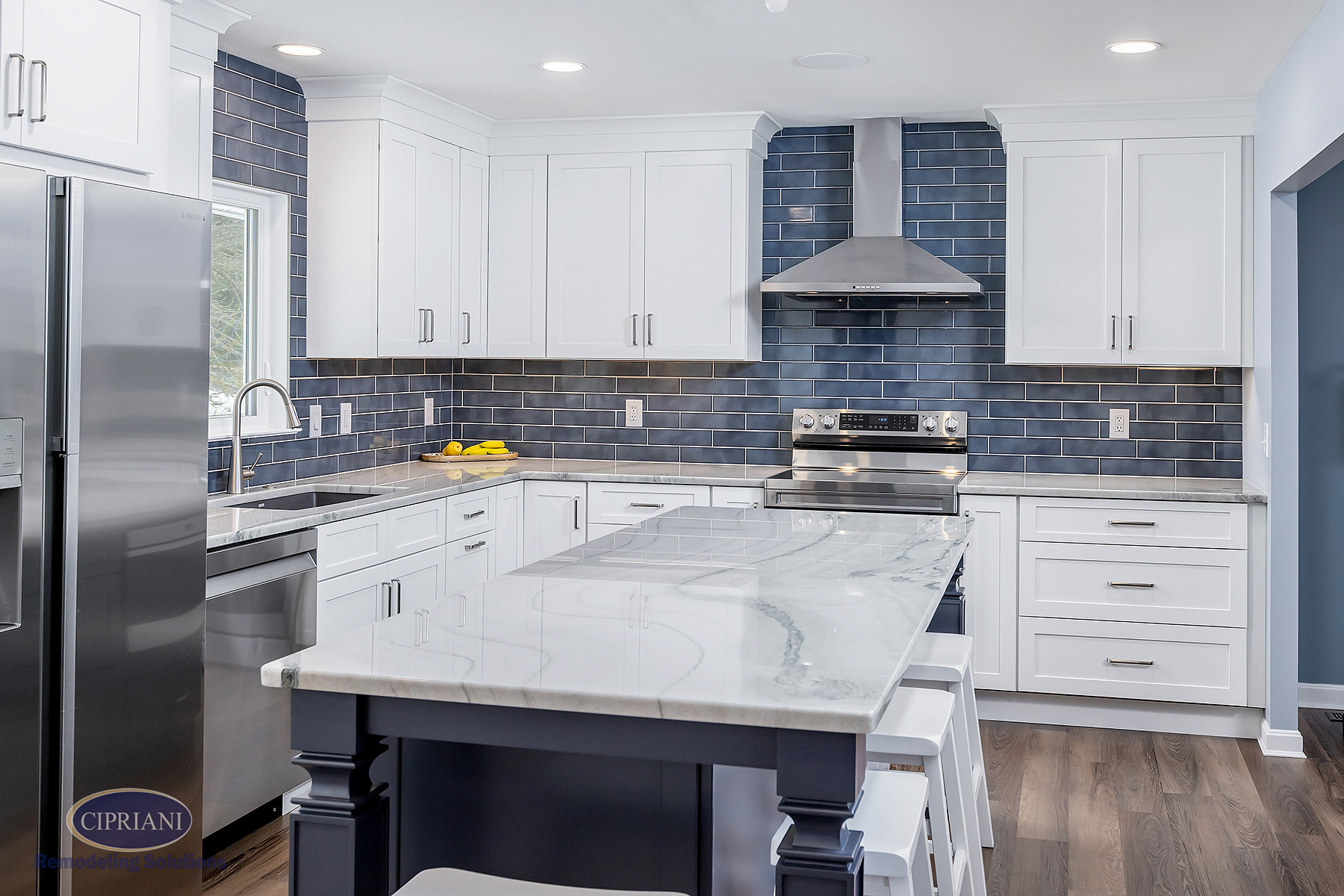 We chose quartzite countertops for their durability and elegance. The natural stone provided a stunning accent around the white cabinetry, creating an appealing contrast. The vibrant blue island introduced a pop of color and personality to the space – adding to the kitchen’s aesthetic appeal as well as offering additional storage and seating options.