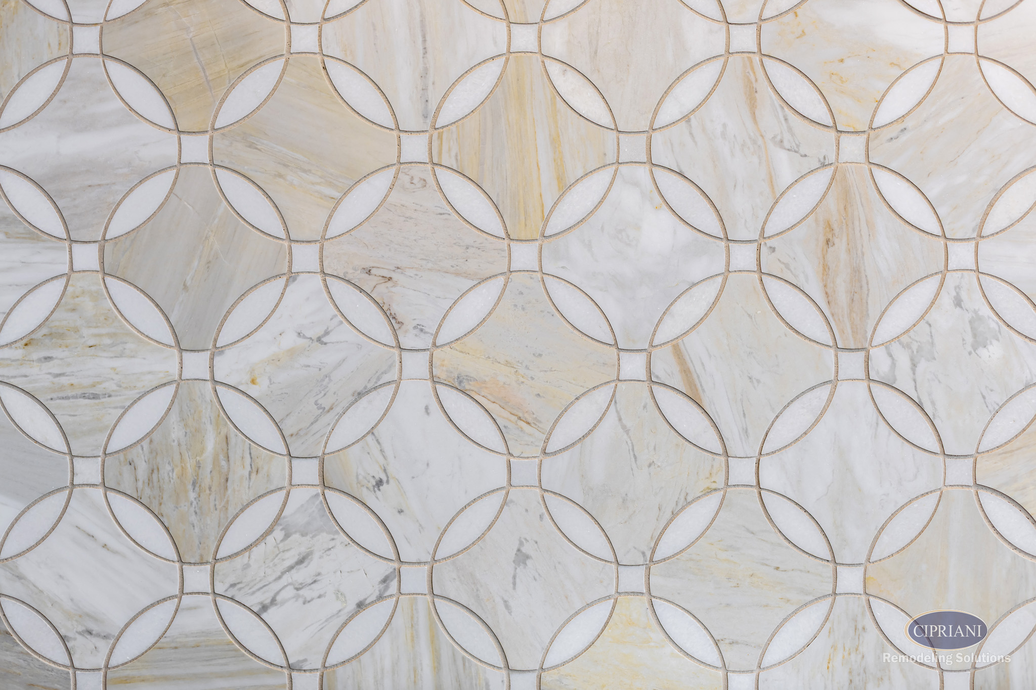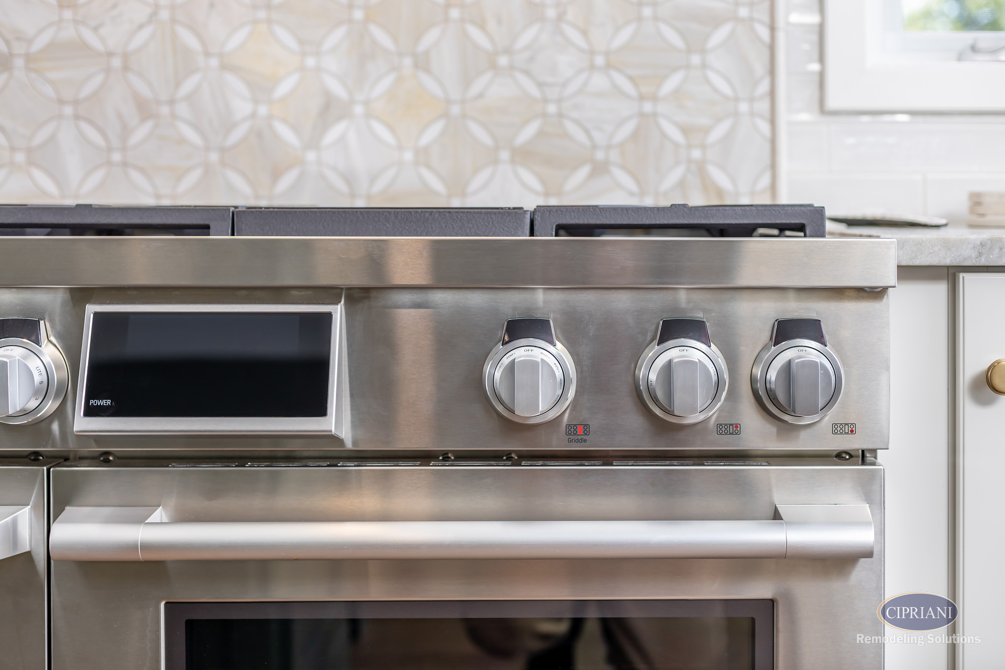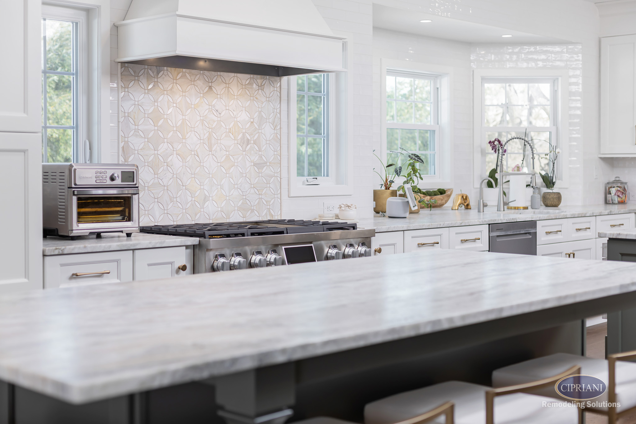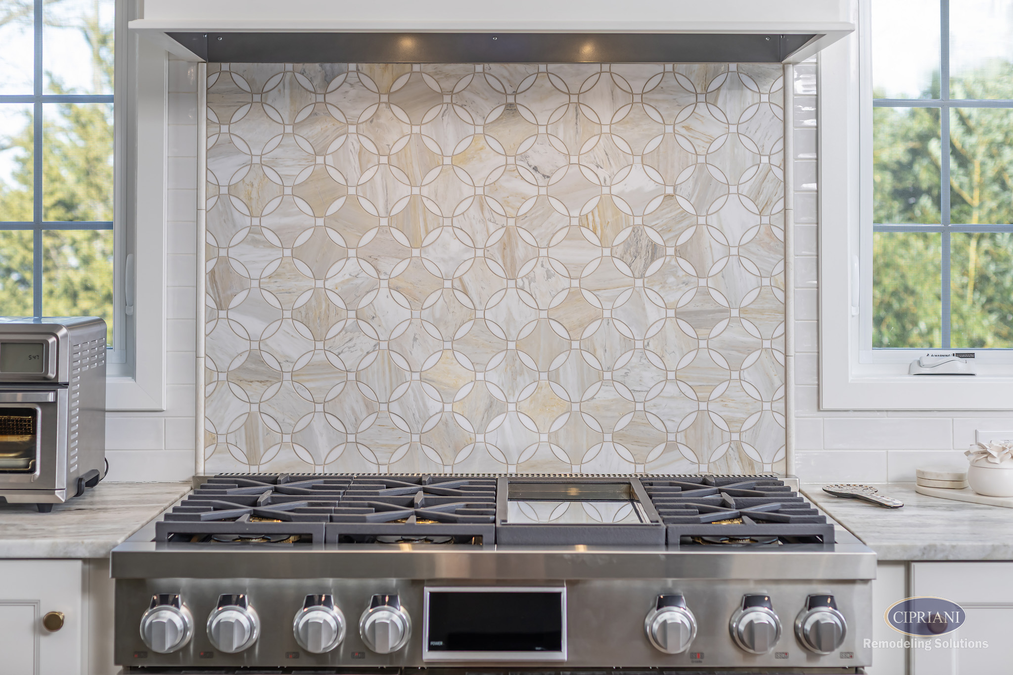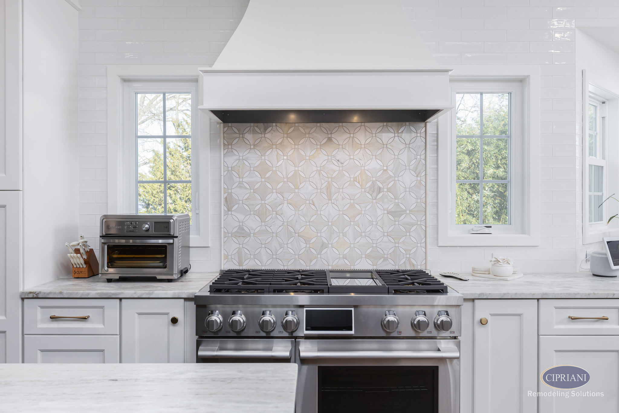 Statement Range Wall: Custom white hood paired with a geometric tile backsplash establishes a refined focal point that blends texture with timeless design.
