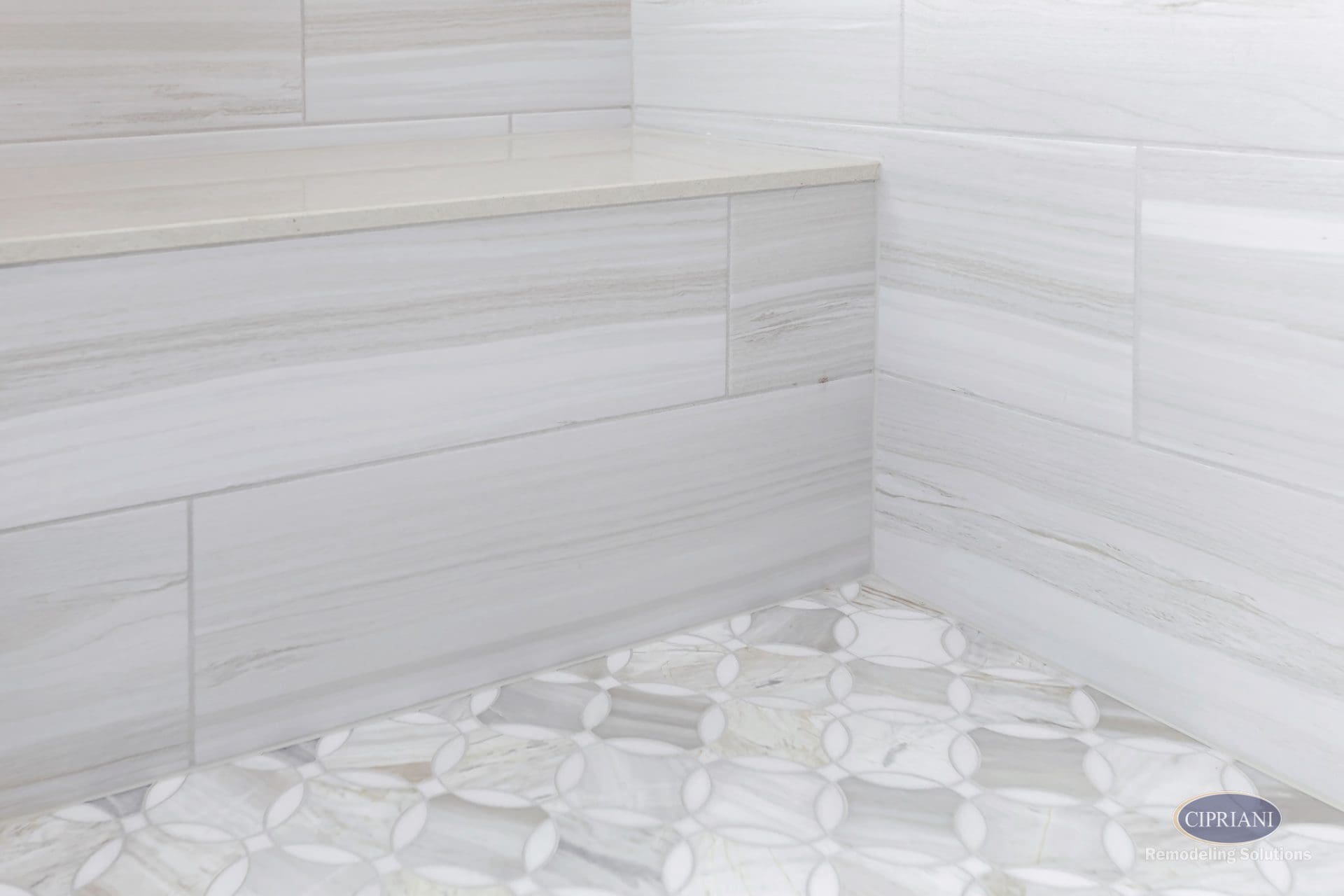 The design began with a standout quartzite countertop. We used slab visualization to align the veining with the vanity bowls. Elegant marble tile ran seamlessly from the floor into the shower, and a custom floral tile with floral details added a meaningful personal touch. Comfort features included a towel warmer, shaving mirror, and heated shower bench inside.