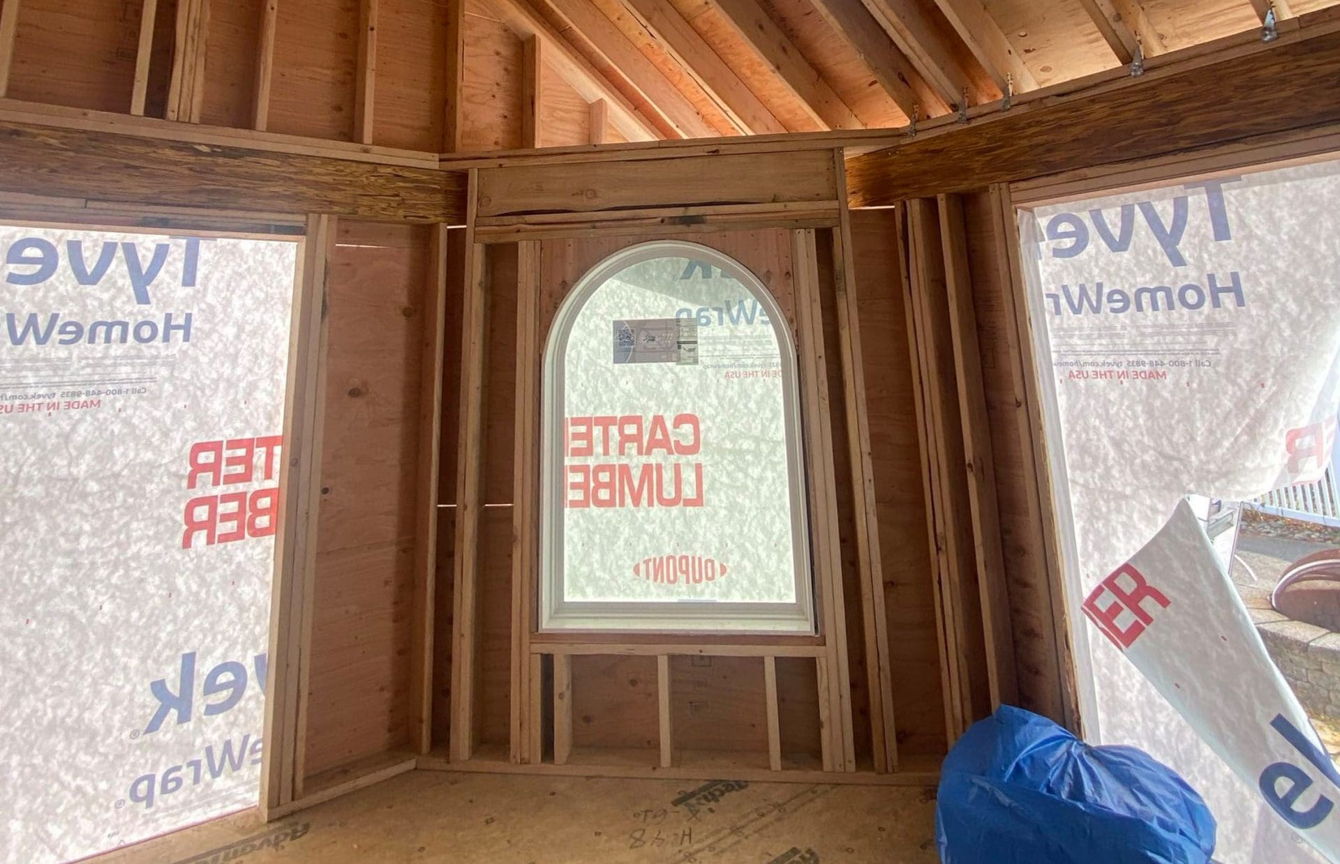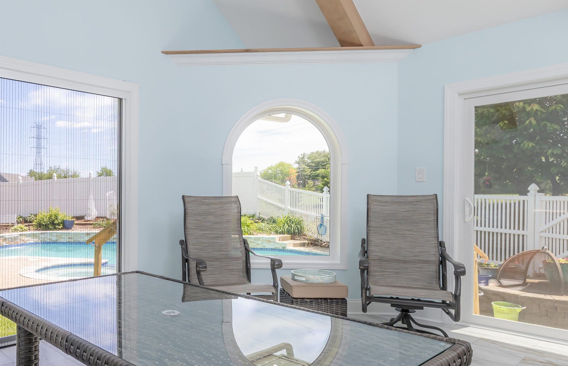 Arched Picture Window: Showcases the backyard and pool view.