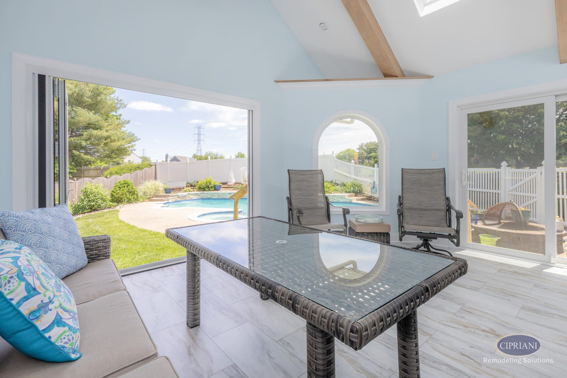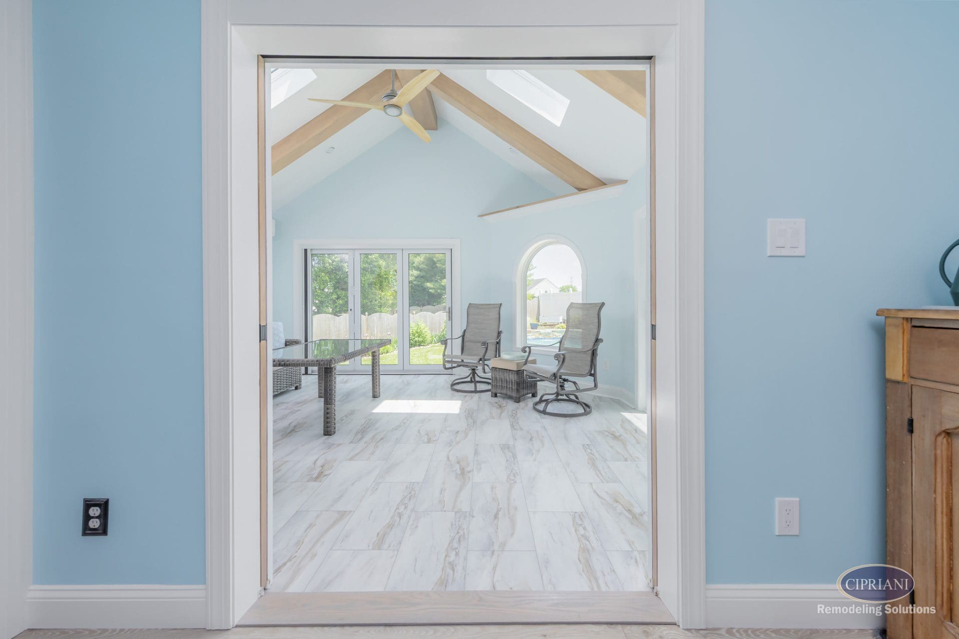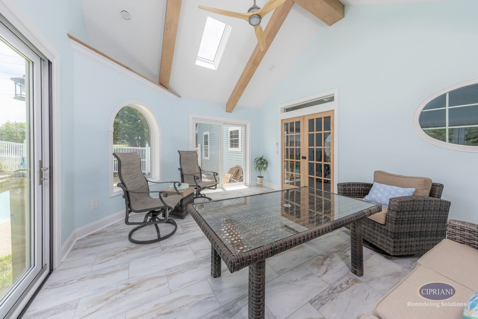 The final design features a vaulted ceiling with flat-lay mitered beams and skylights that brighten the space and add height. A three-panel accordion slider opens the room to the outdoors, while a custom oval window brings light into the laundry room. Stained pocket doors separate the sunroom from the main living area for a warm, cohesive look.
