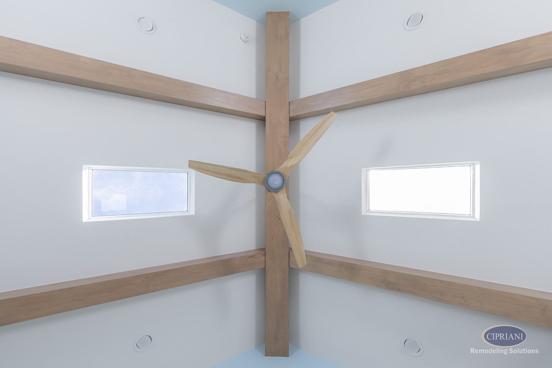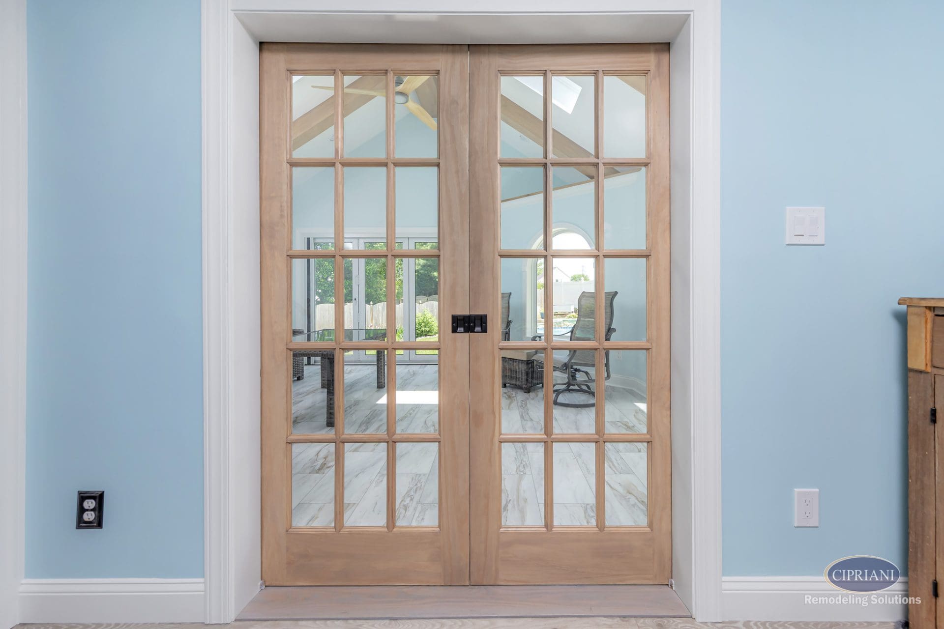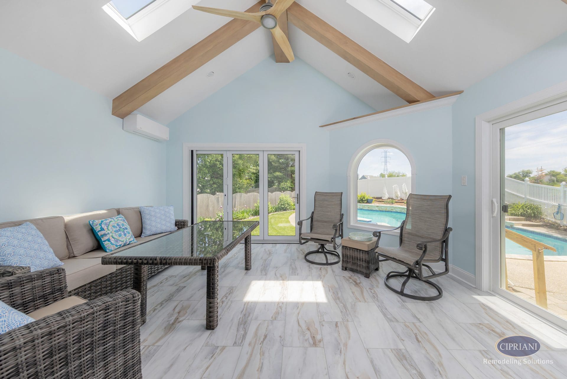 The final design features a vaulted ceiling with flat-lay mitered beams and skylights that brighten the space and add height. A three-panel accordion slider opens the room to the outdoors, while a custom oval window brings light into the laundry room. Stained pocket doors separate the sunroom from the main living area for a warm, cohesive look.