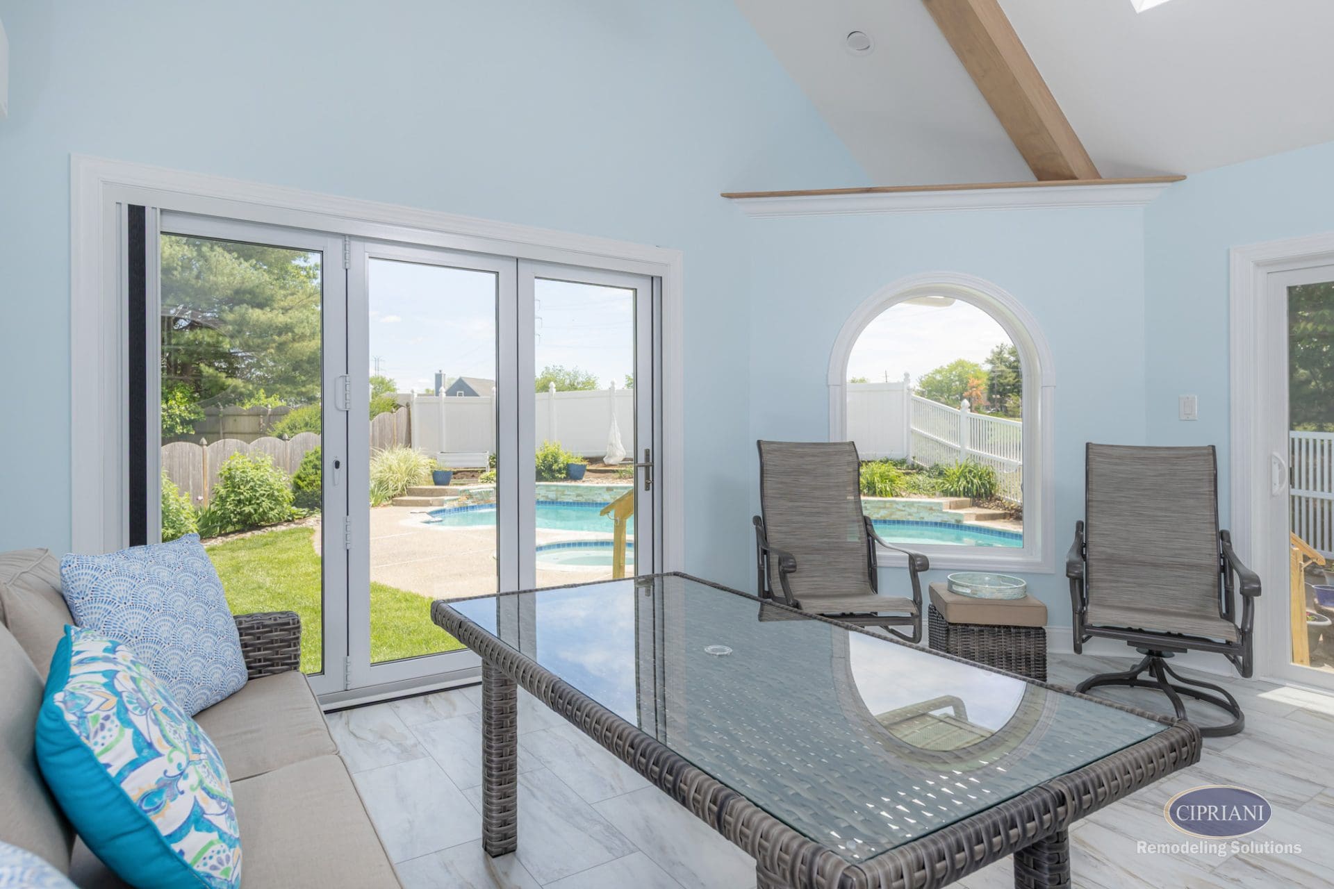 This bright and airy sunroom addition was designed to maximize backyard enjoyment. The homeowners wanted a seamless connection to their pool area and a space filled with natural light. Multiple design options were considered before finalizing a layout that worked within property setbacks while still delivering an open, inviting feel.