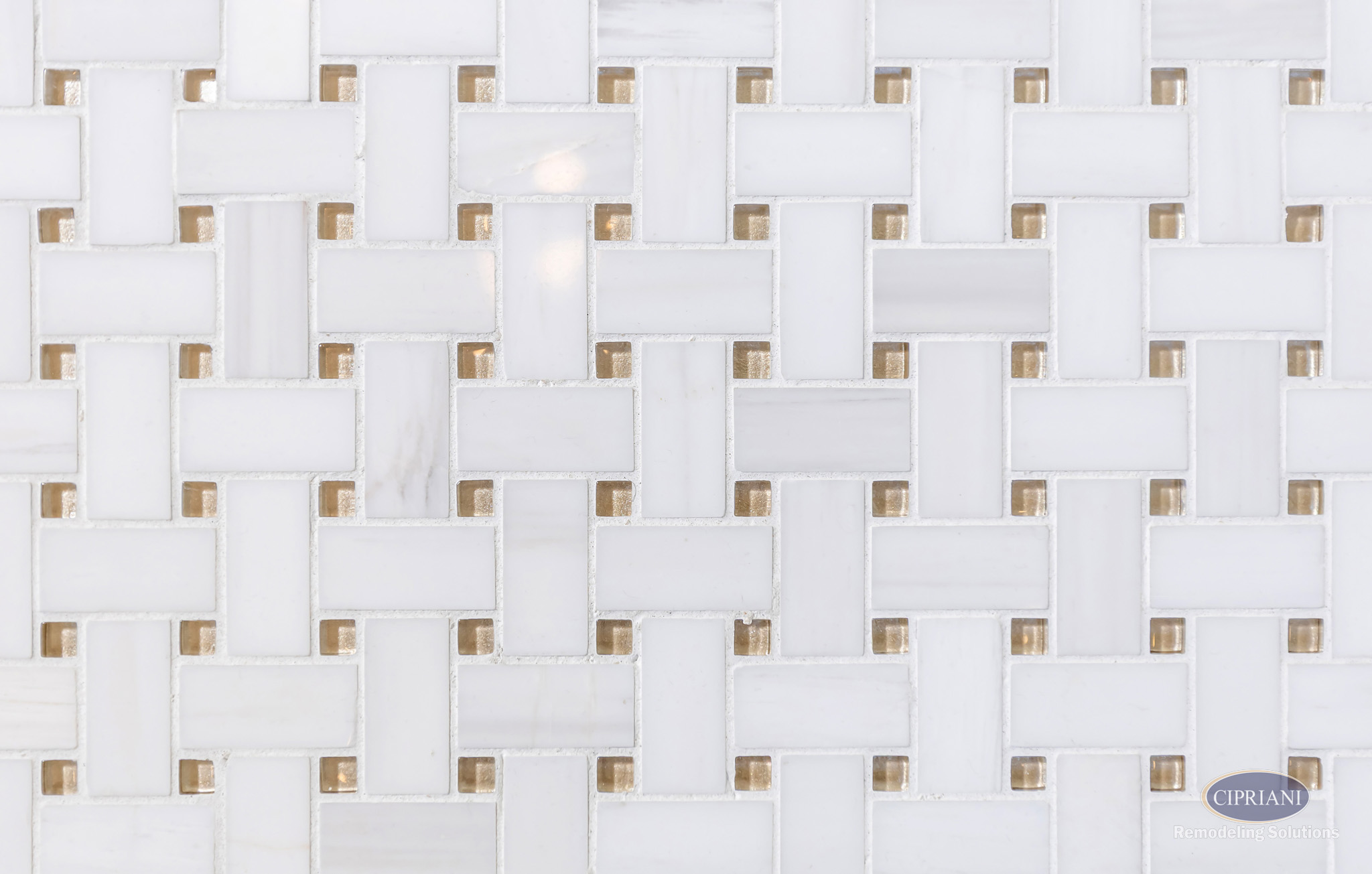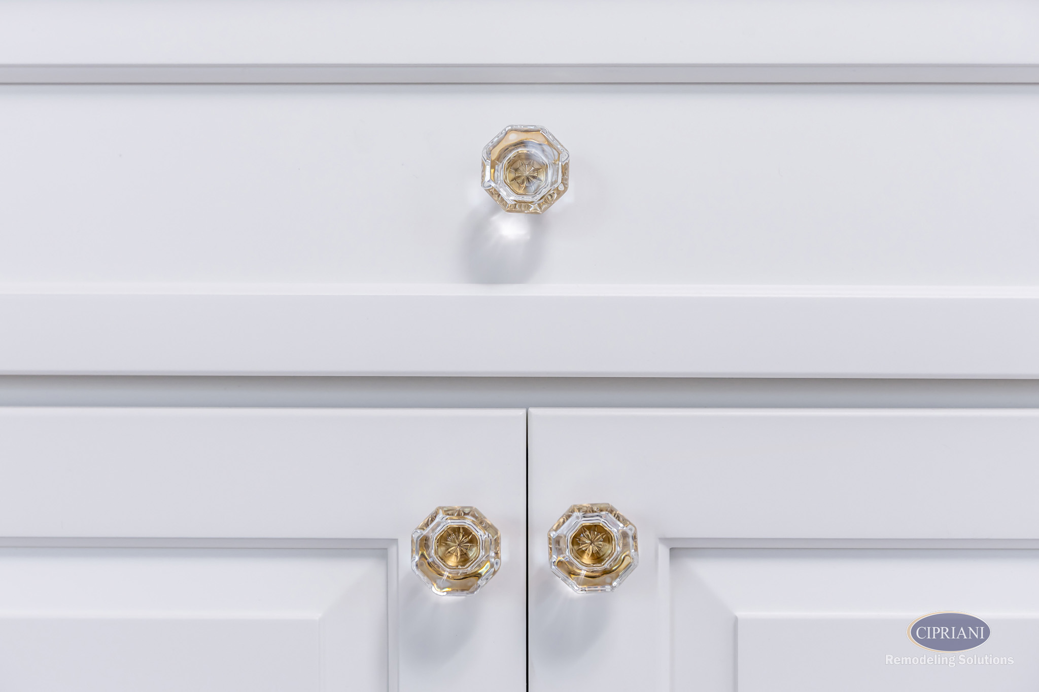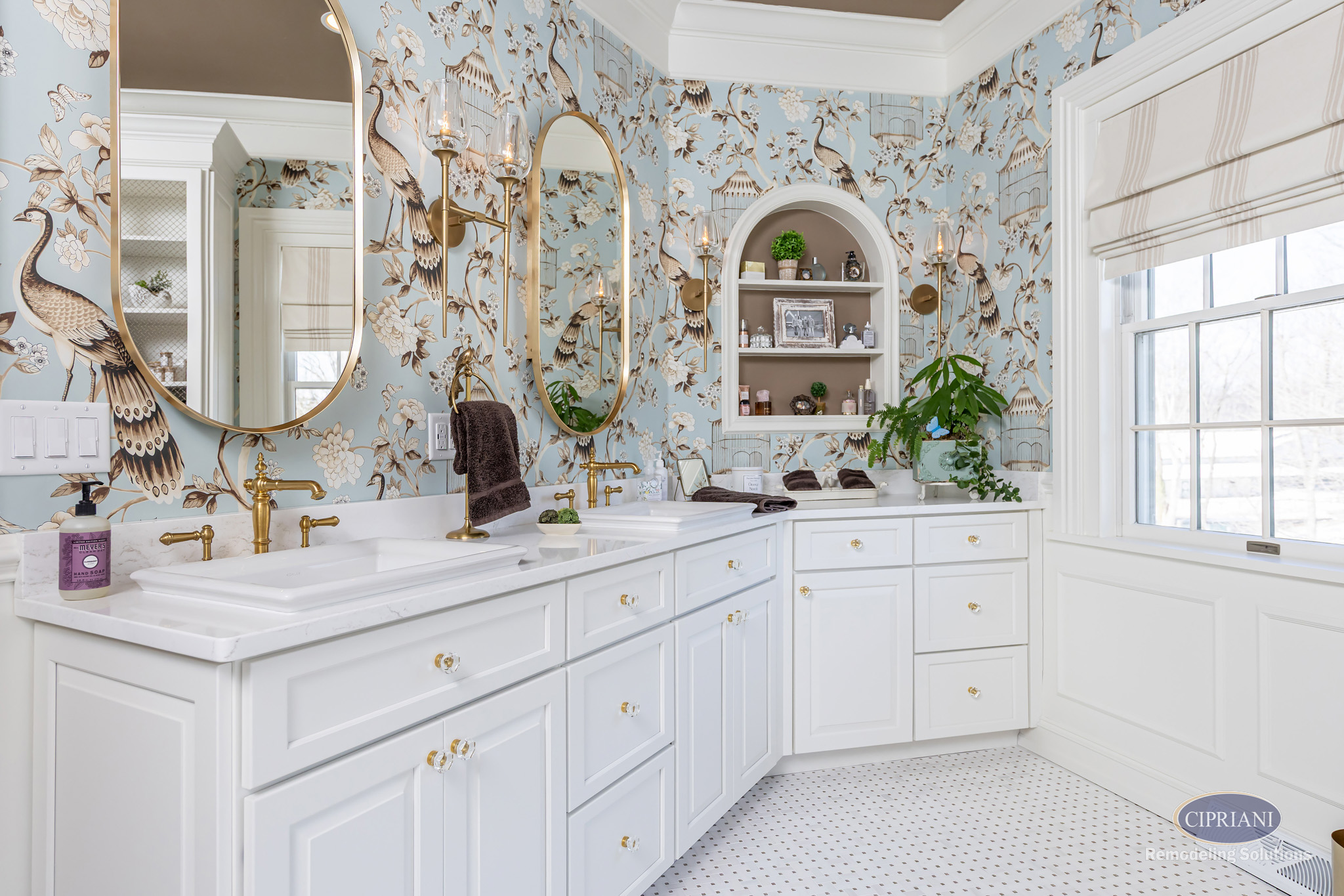 Custom Vanity Cabinetry: White double vanity with brass hardware provides tailored storage with classic styling.