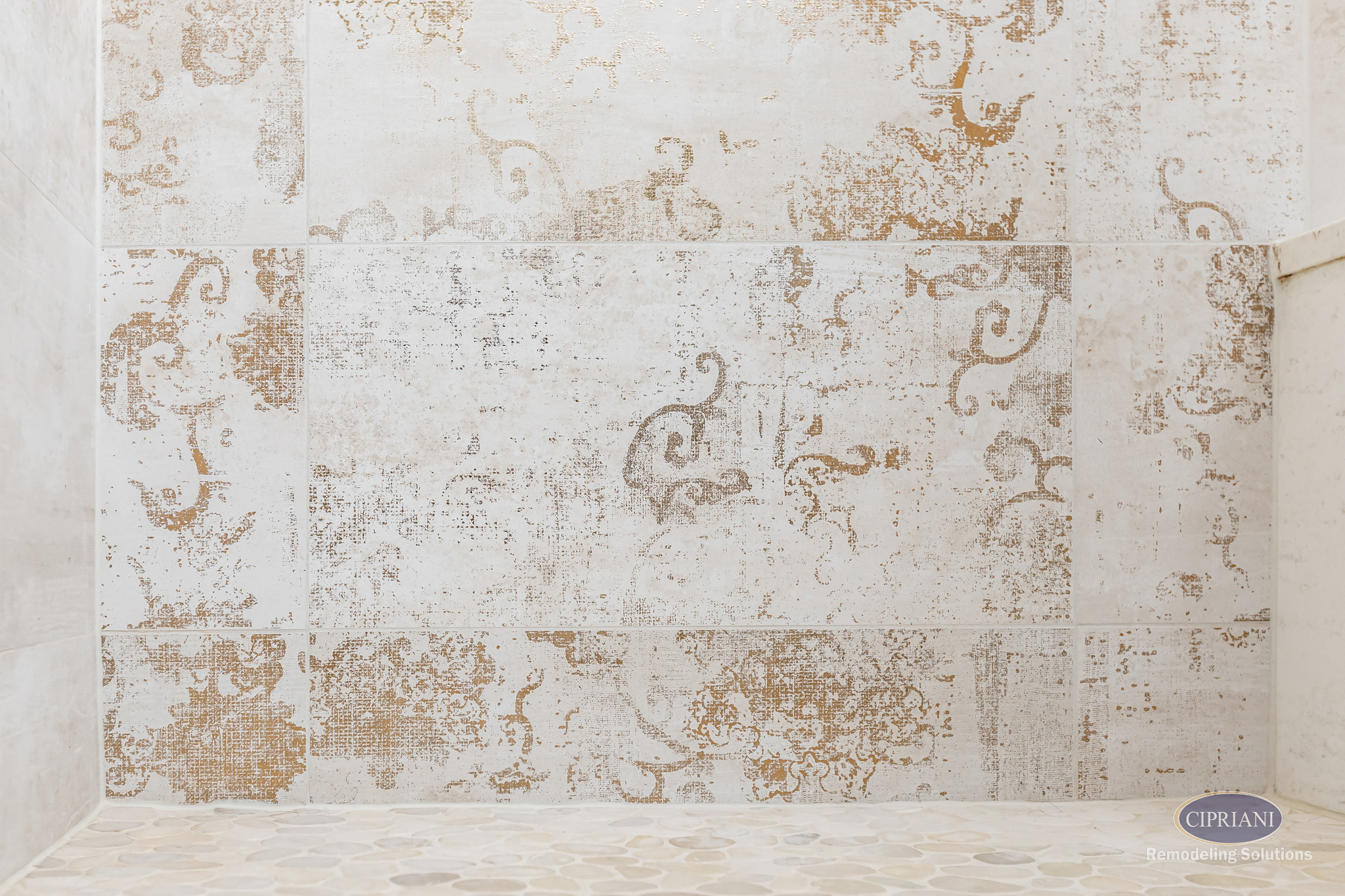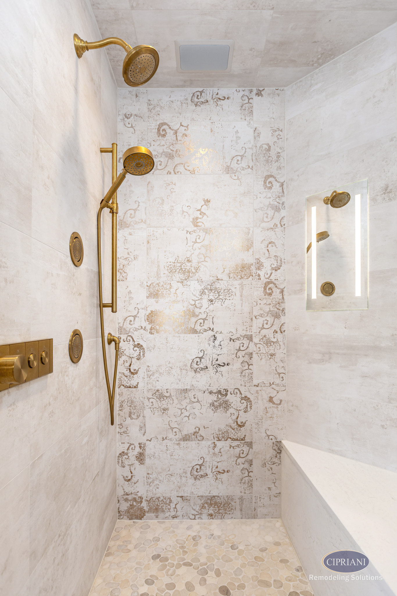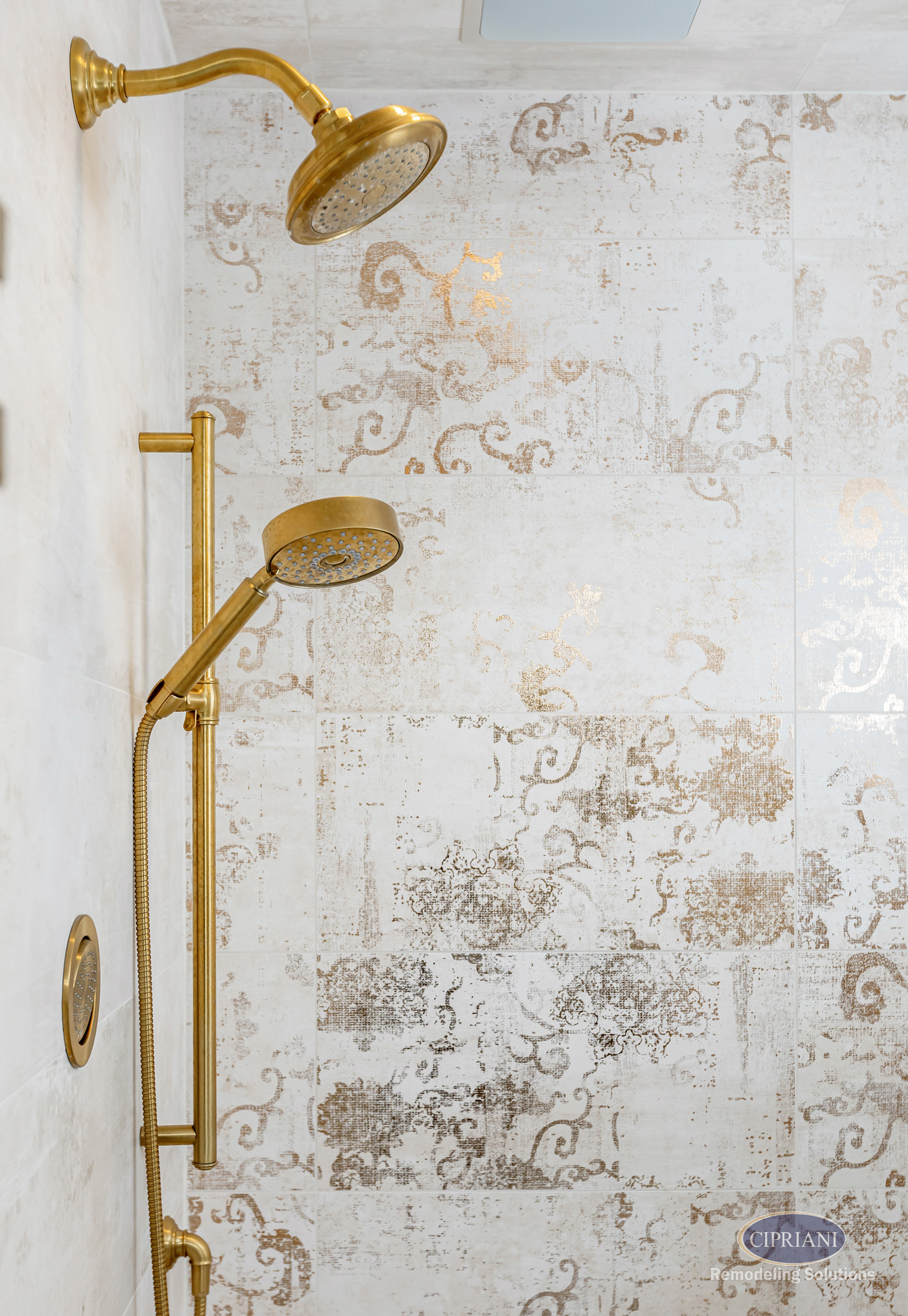 Glass Walk-In Shower: Spacious shower with patterned tile, pebble flooring, and brass fixtures for a refined spa experience.