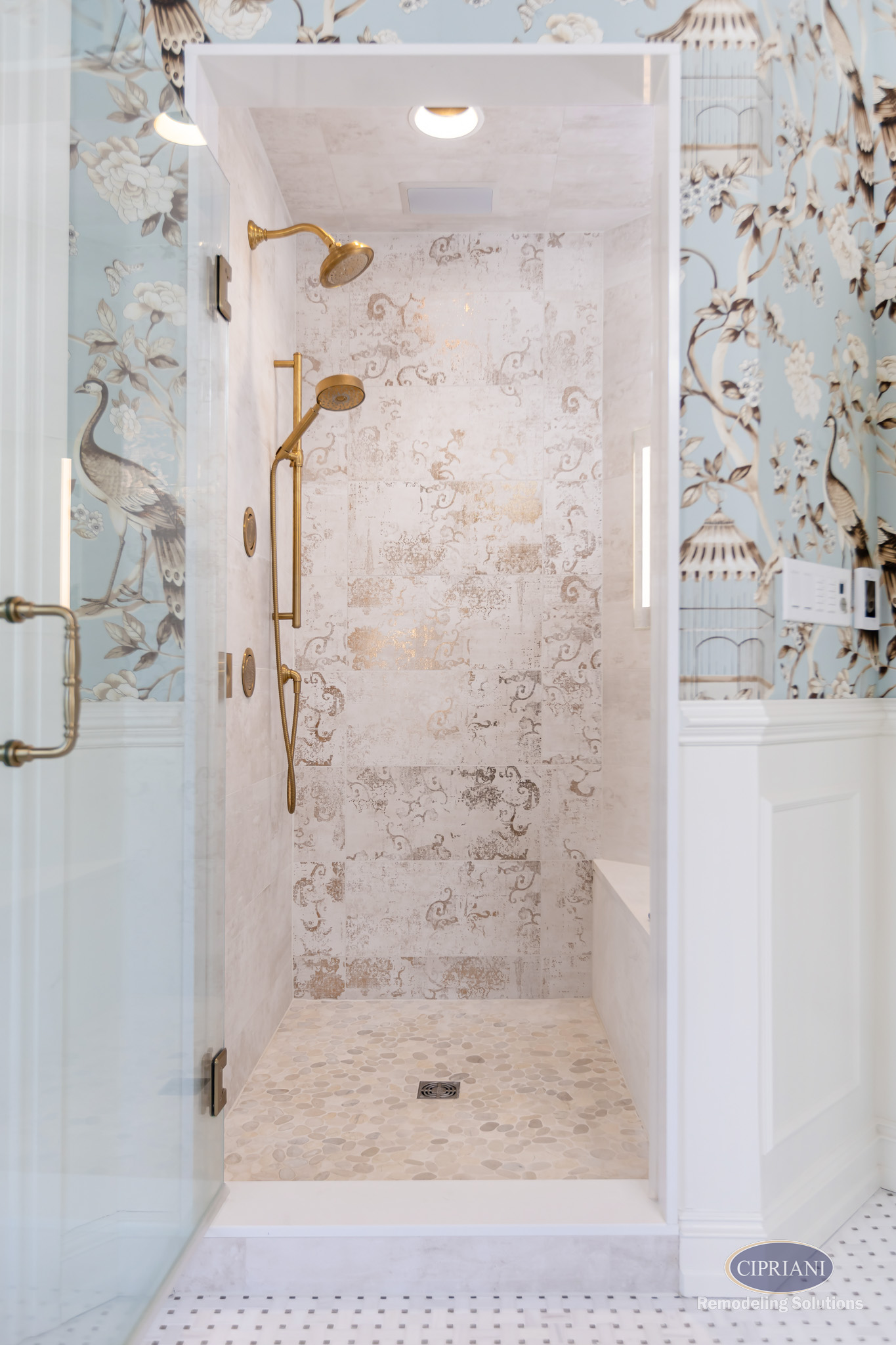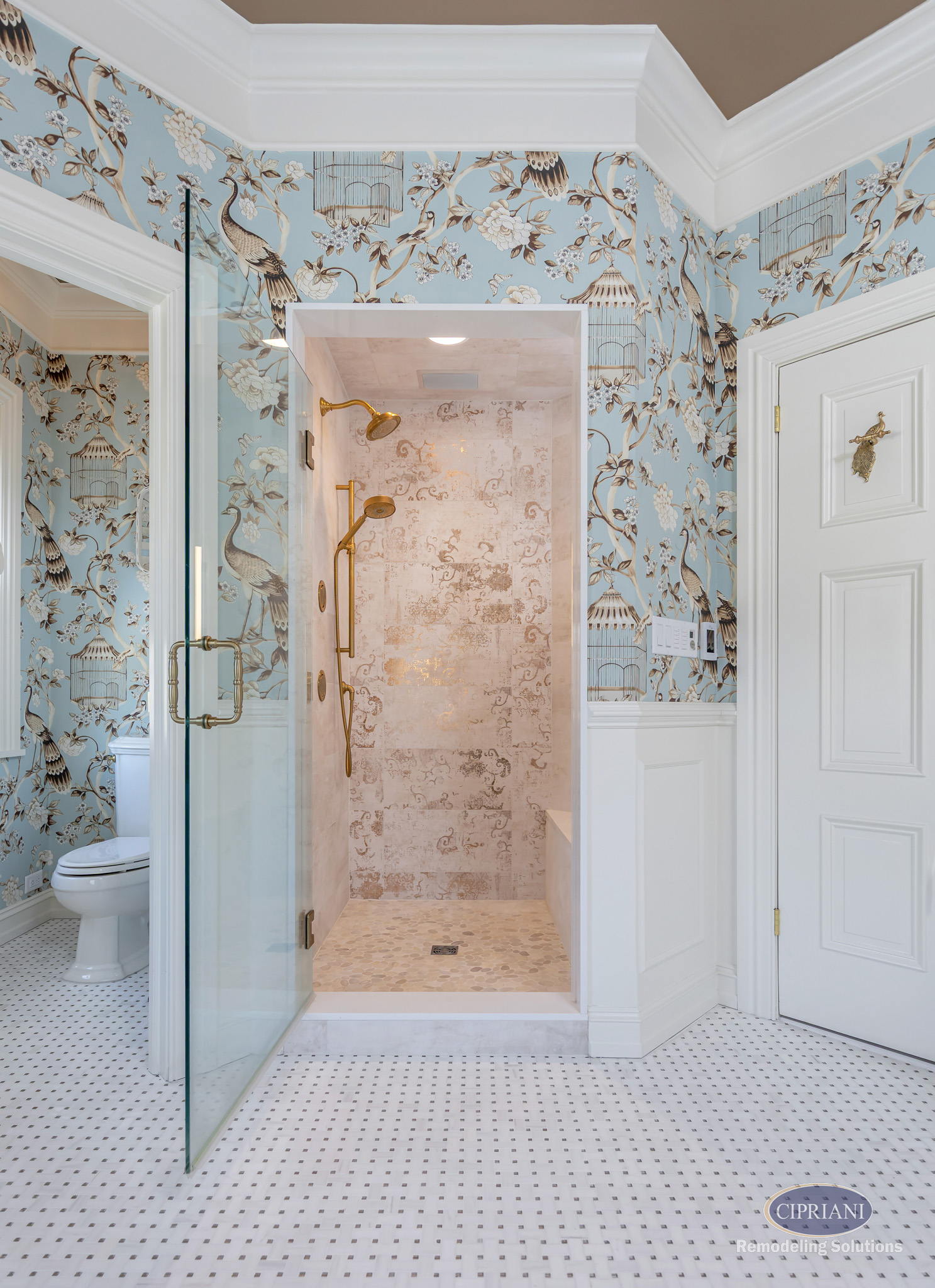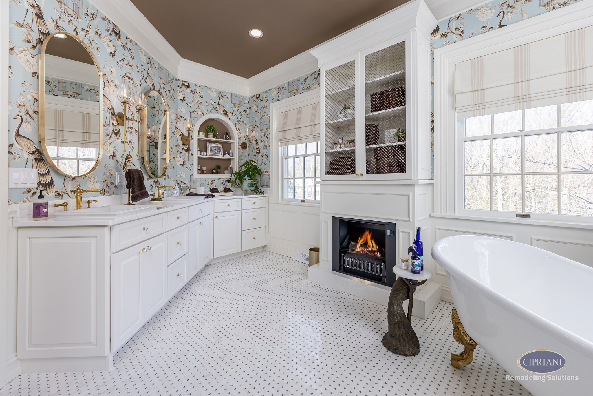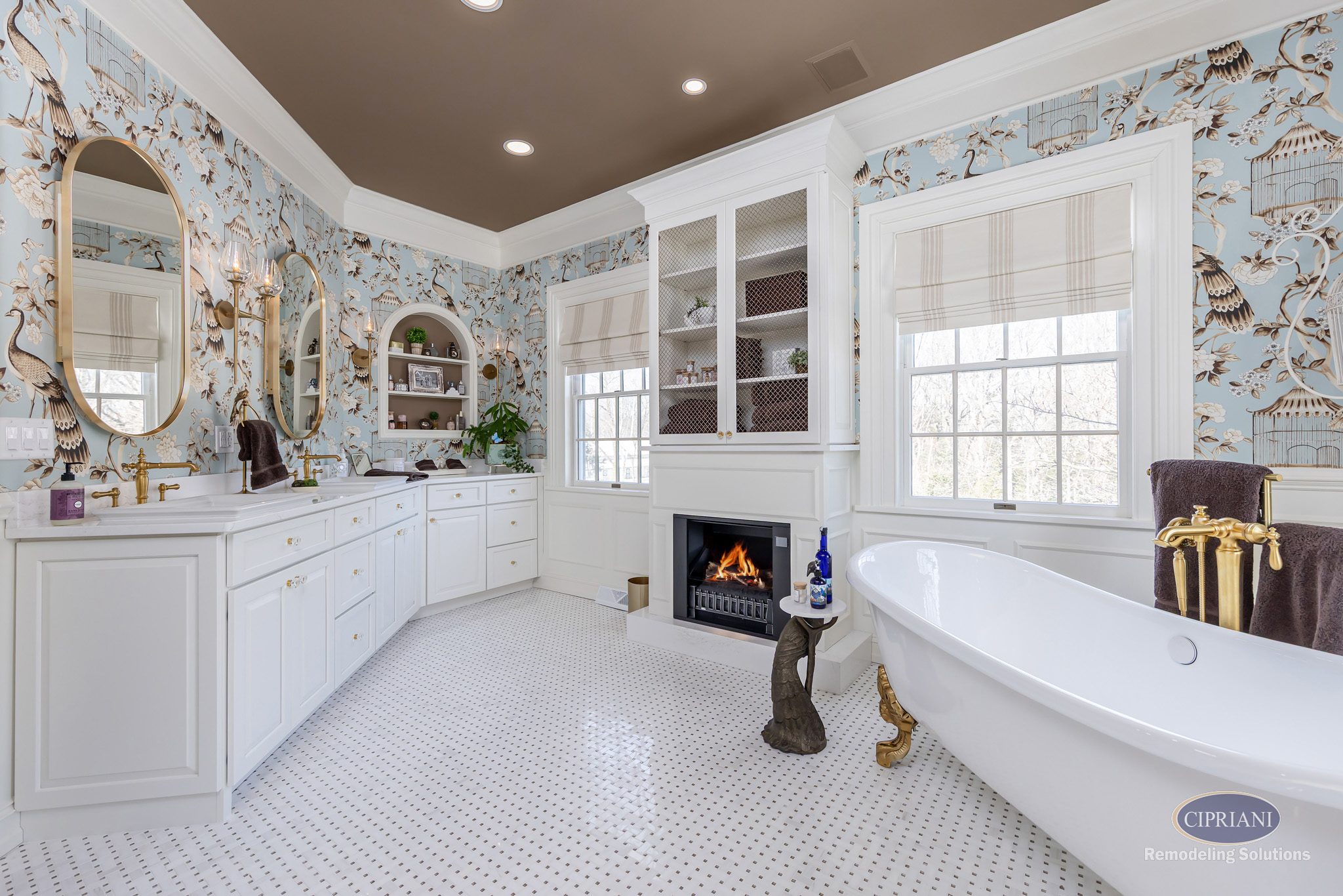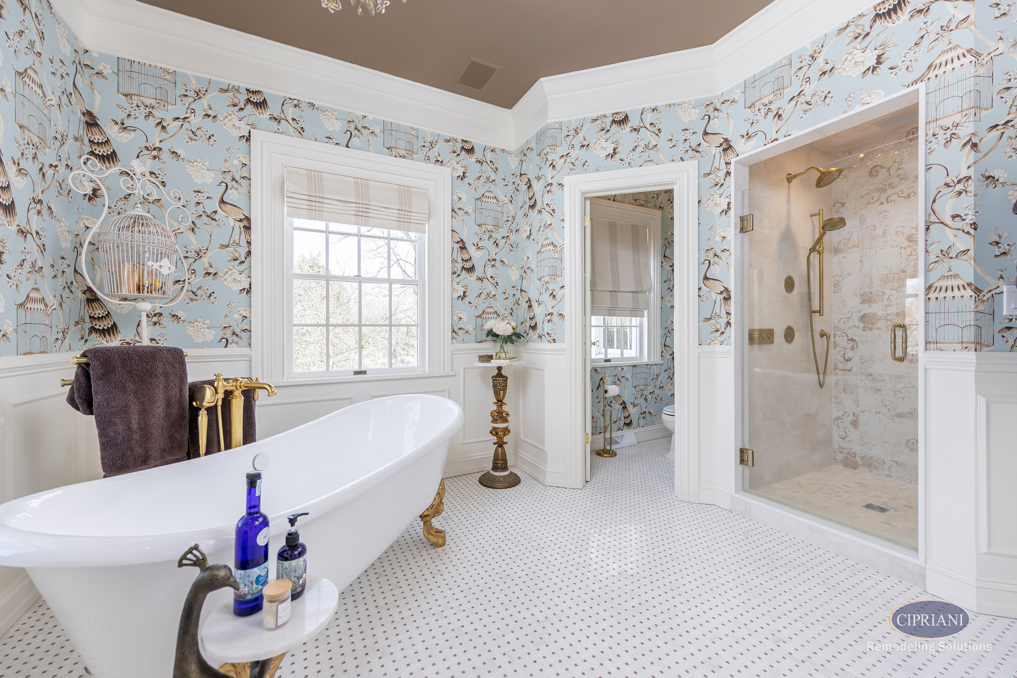 These homeowners wanted to transform their primary bathroom into a sophisticated retreat reflecting their love of elegant, classic design. The space features refined millwork, statement chinoiserie wallpaper, and warm brass fixtures that bring luxury to everyday routines. A freestanding soaking tub creates a relaxing focal point, while the glass walk-in shower offers a spacious, spa-like experience. The result is a polished bathroom that feels serene and uniquely personal.