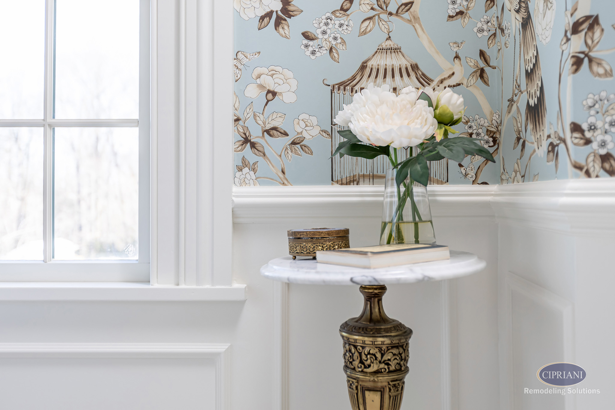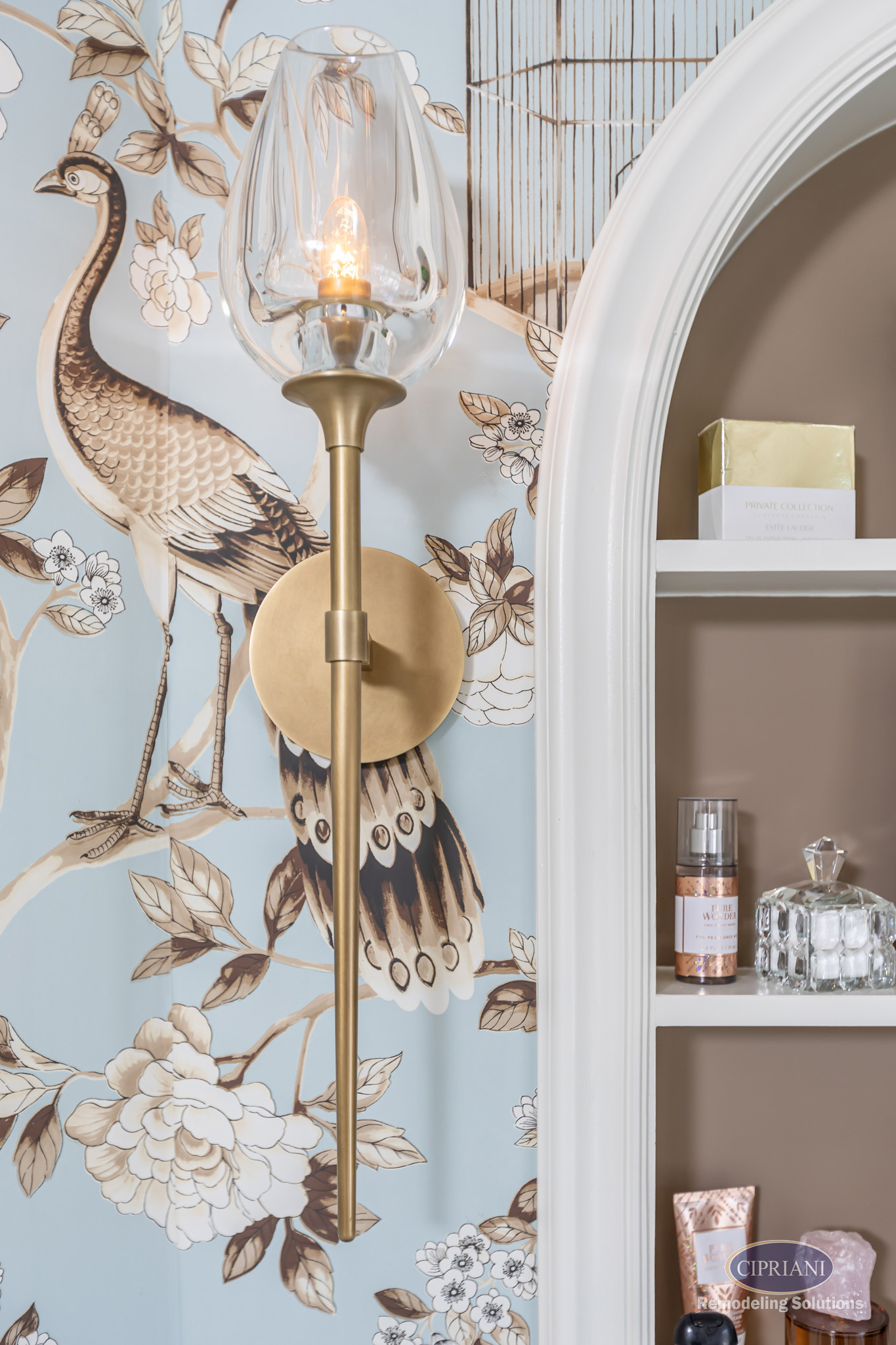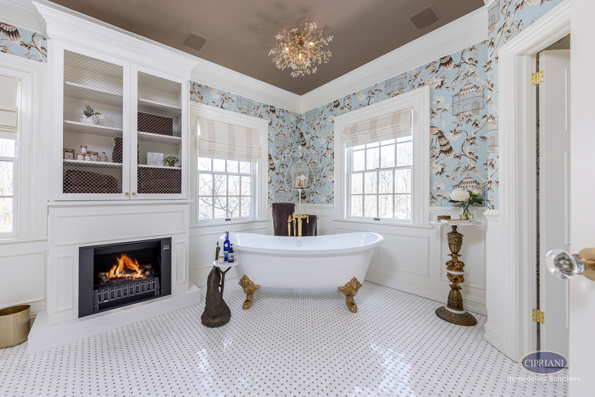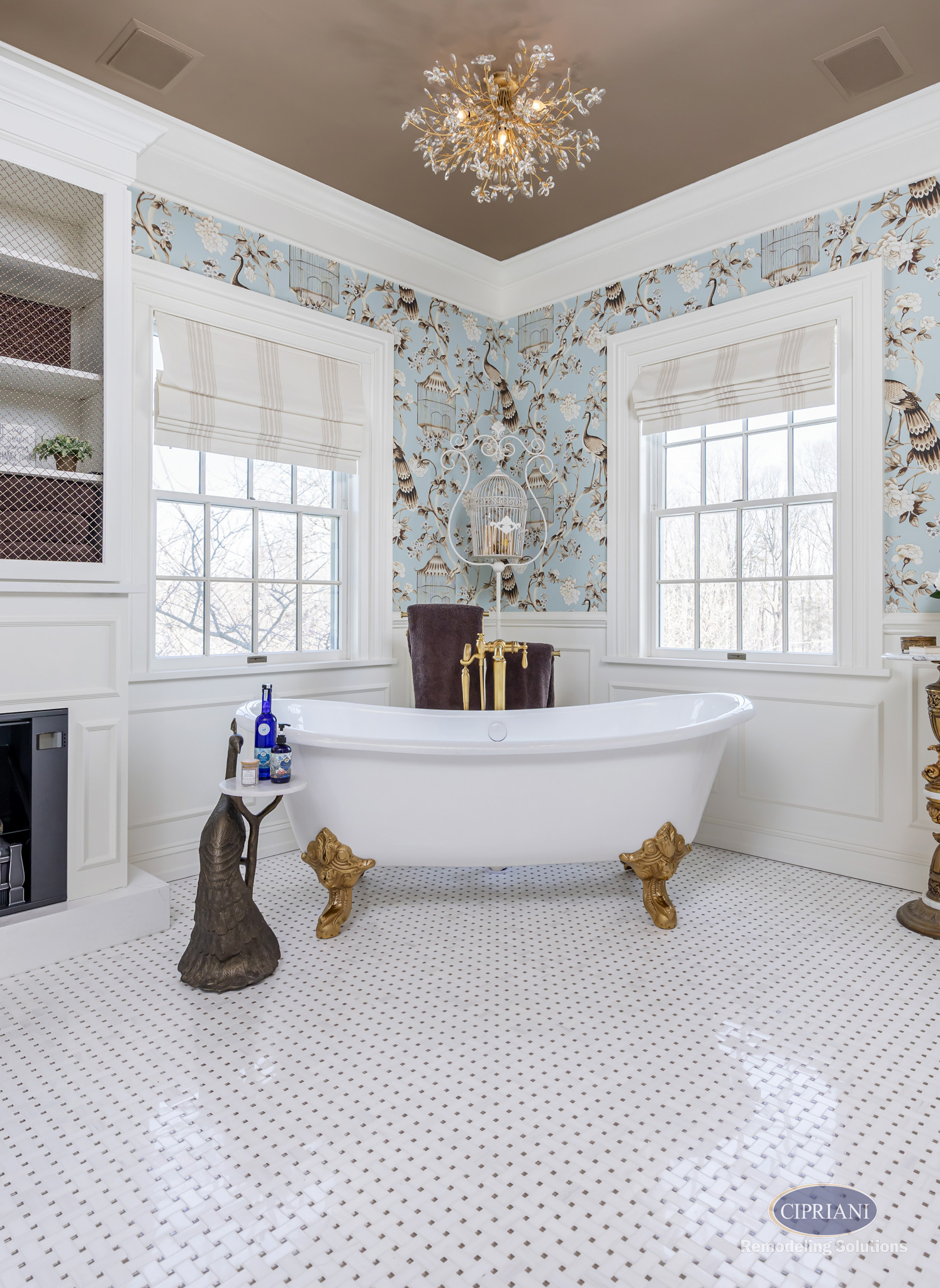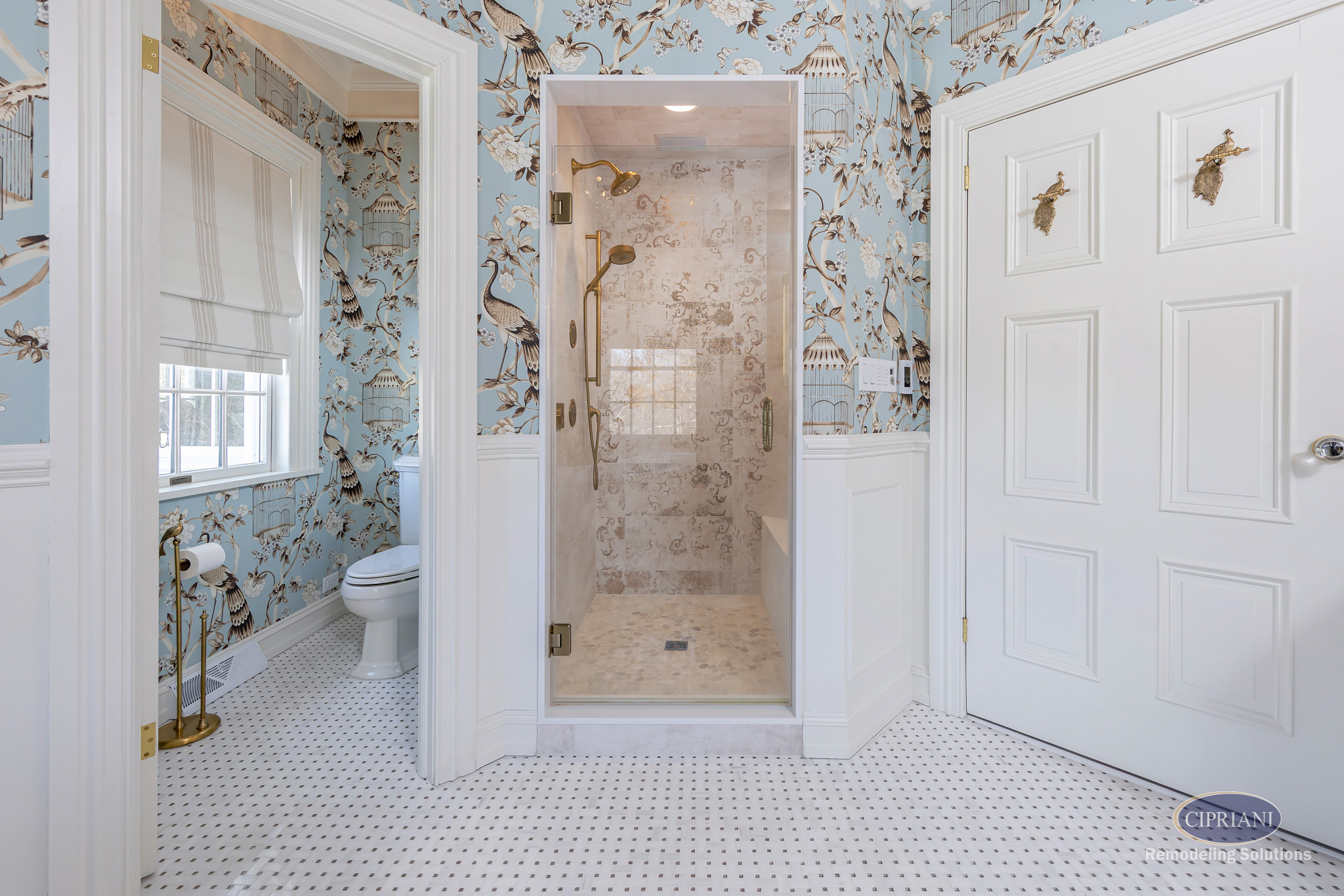 These homeowners wanted to transform their primary bathroom into a sophisticated retreat reflecting their love of elegant, classic design. The space features refined millwork, statement chinoiserie wallpaper, and warm brass fixtures that bring luxury to everyday routines. A freestanding soaking tub creates a relaxing focal point, while the glass walk-in shower offers a spacious, spa-like experience. The result is a polished bathroom that feels serene and uniquely personal.