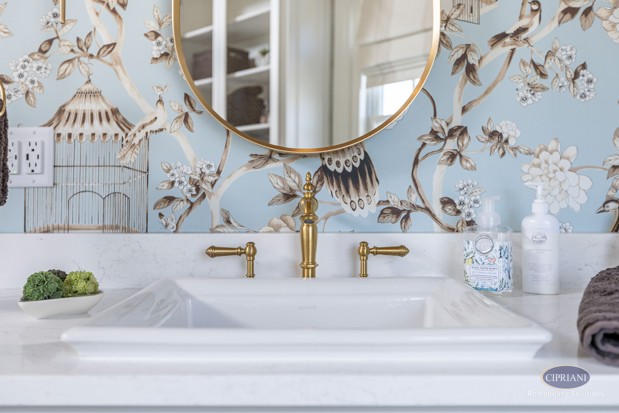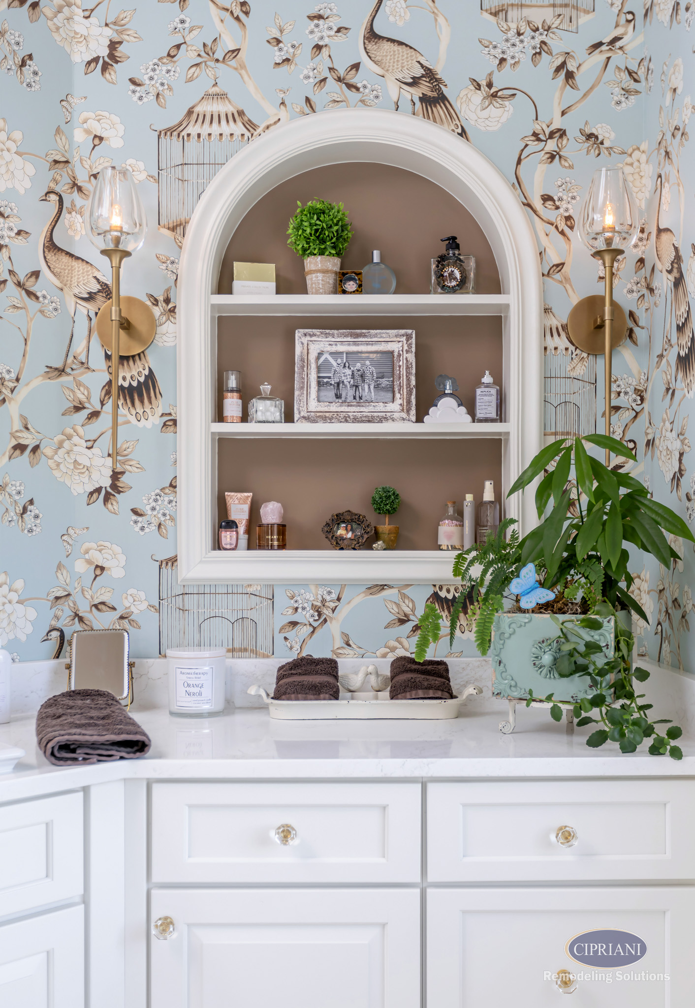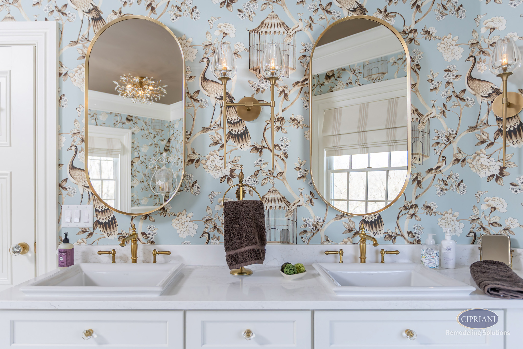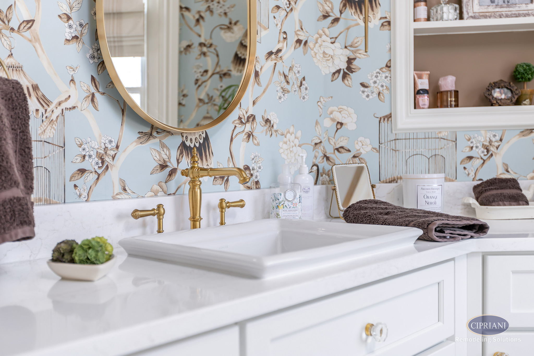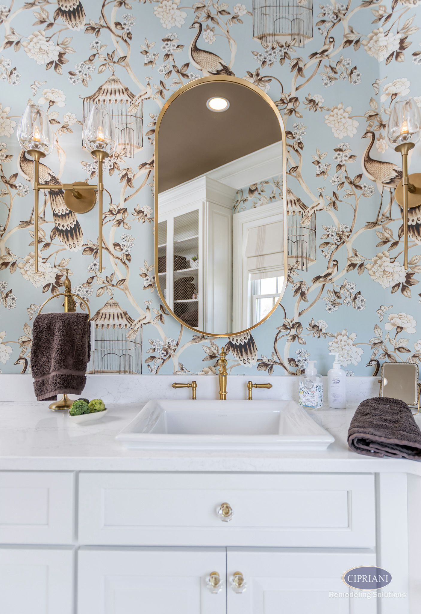 These homeowners wanted to transform their primary bathroom into a sophisticated retreat reflecting their love of elegant, classic design. The space features refined millwork, statement chinoiserie wallpaper, and warm brass fixtures that bring luxury to everyday routines. A freestanding soaking tub creates a relaxing focal point, while the glass walk-in shower offers a spacious, spa-like experience. The result is a polished bathroom that feels serene and uniquely personal.