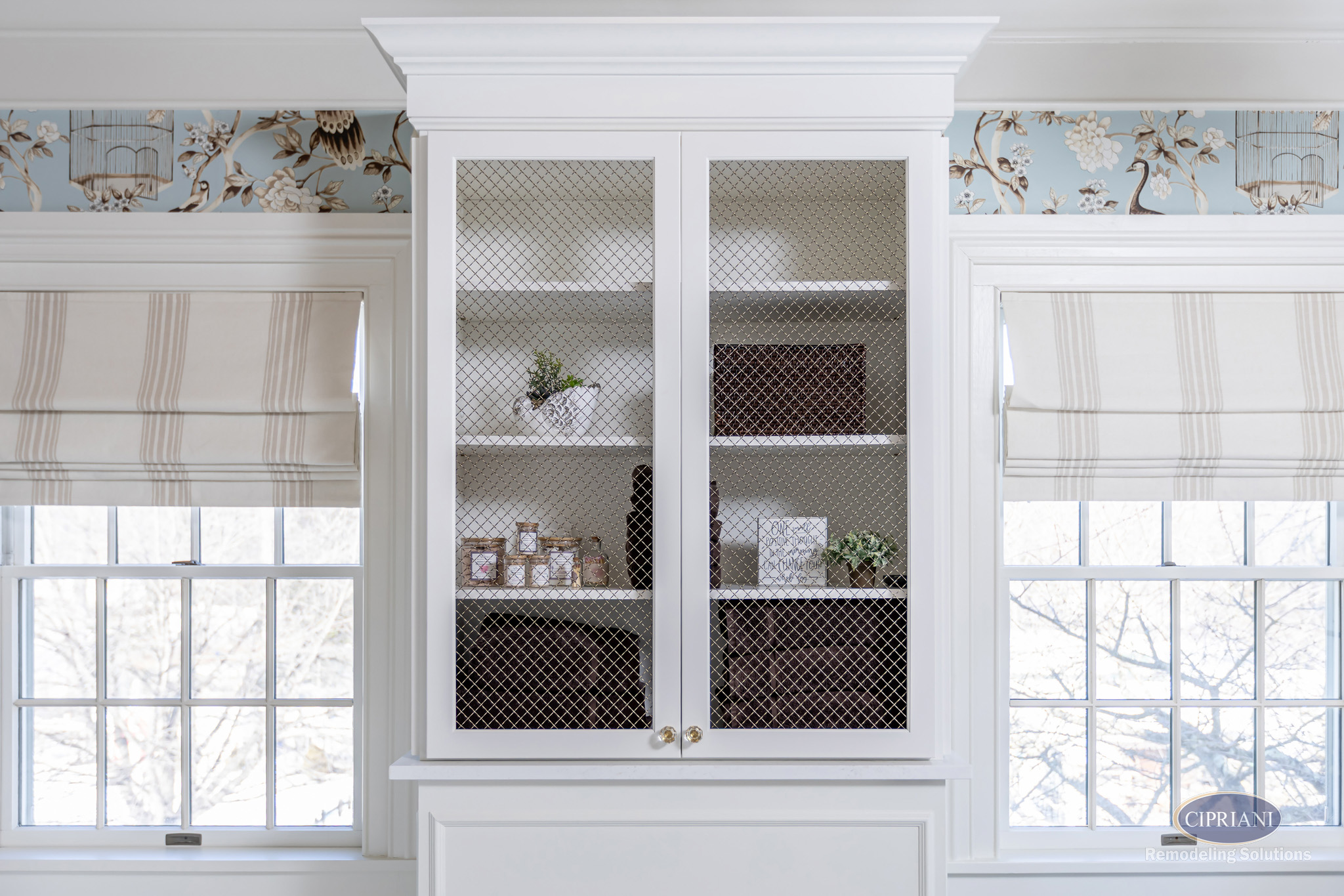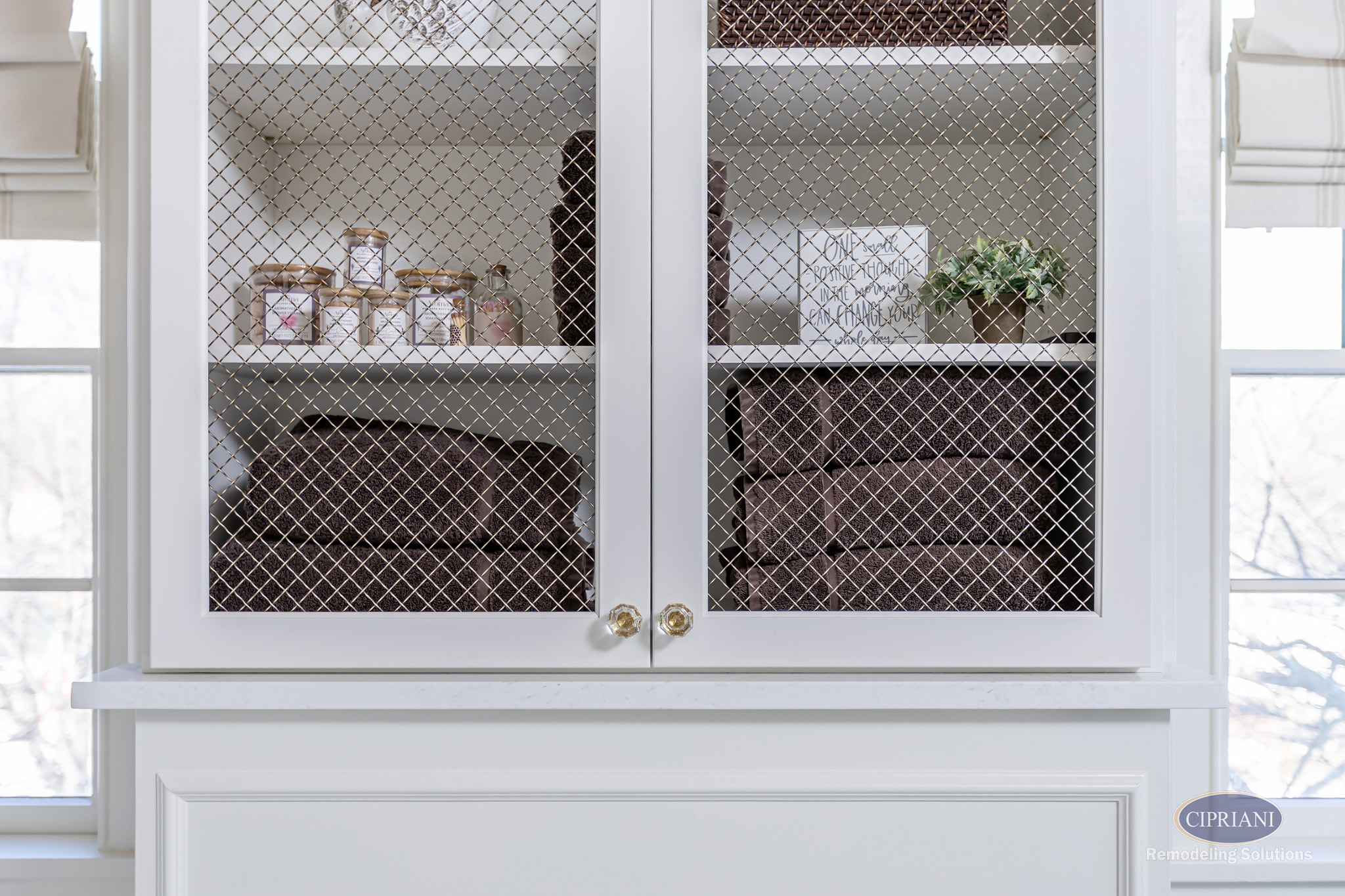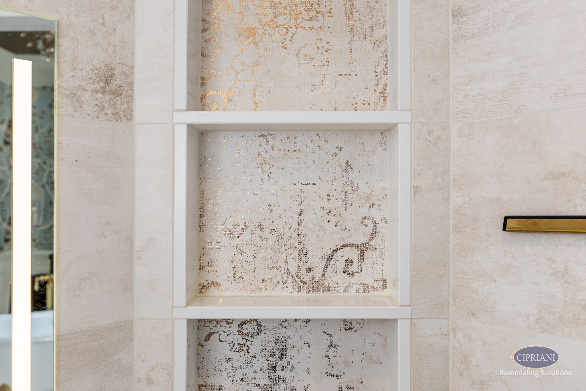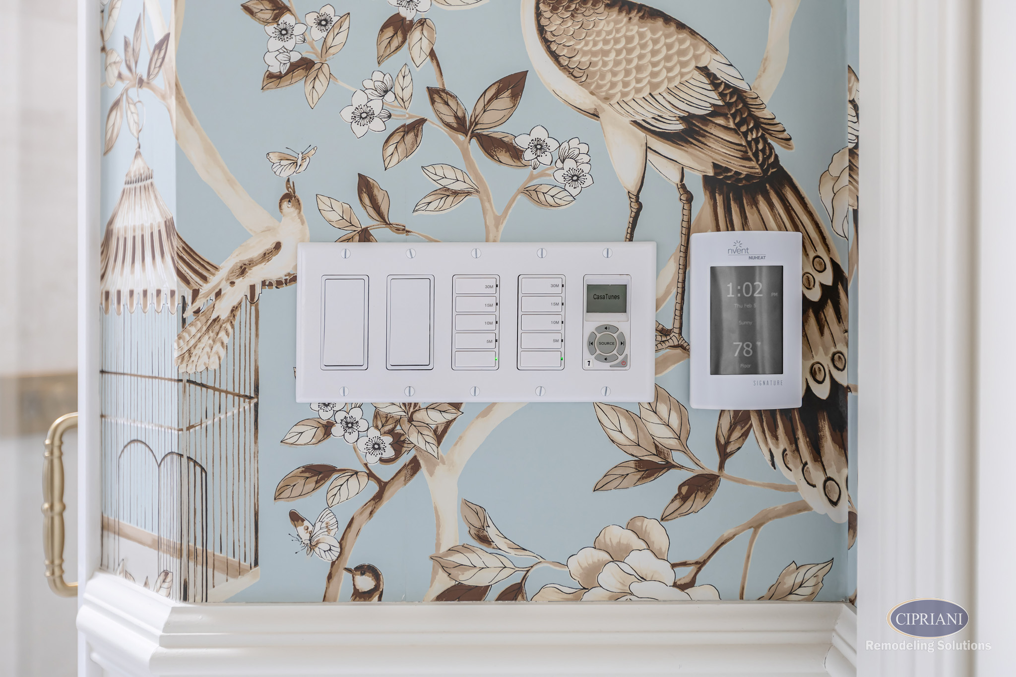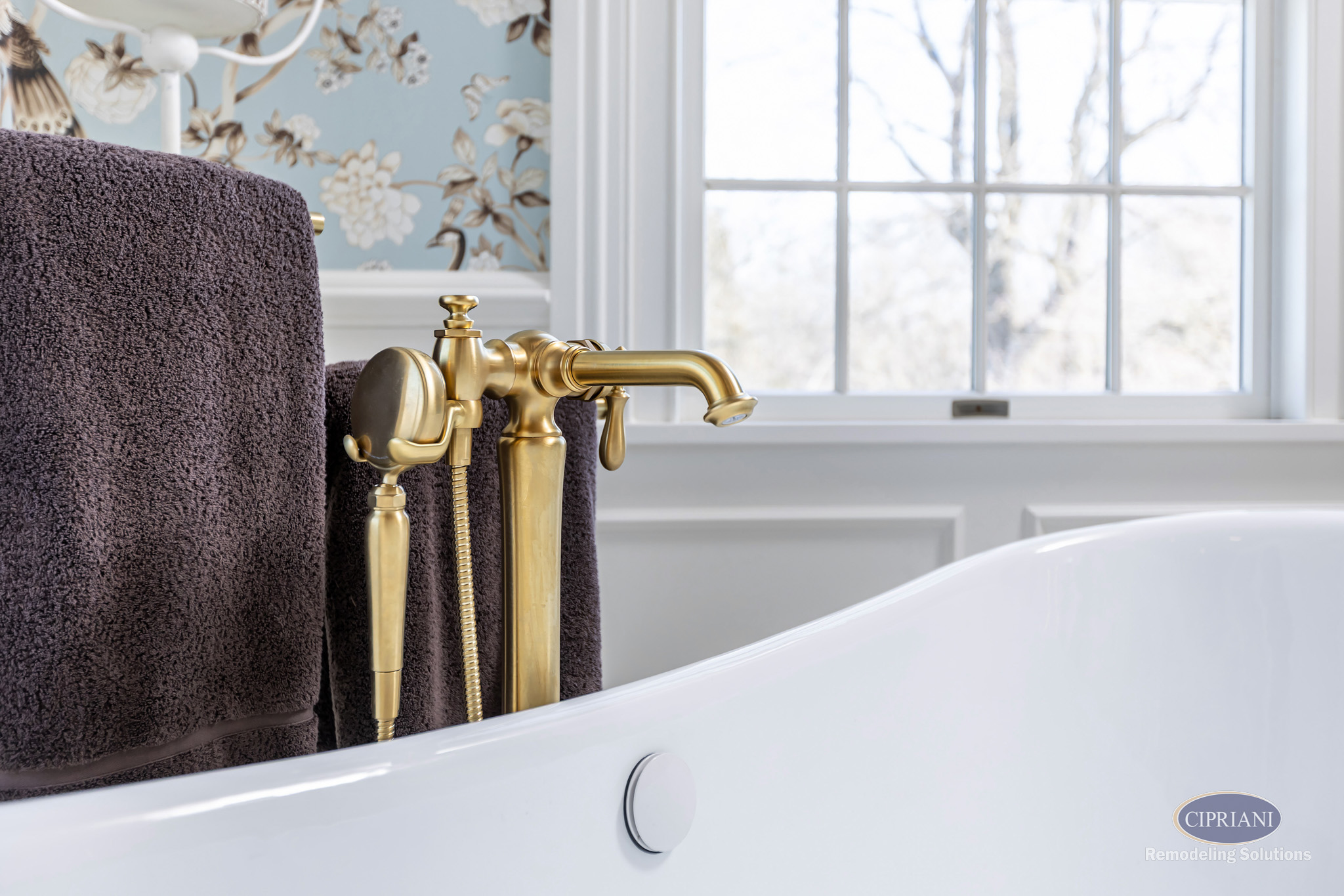 These homeowners wanted to transform their primary bathroom into a sophisticated retreat reflecting their love of elegant, classic design. The space features refined millwork, statement chinoiserie wallpaper, and warm brass fixtures that bring luxury to everyday routines. A freestanding soaking tub creates a relaxing focal point, while the glass walk-in shower offers a spacious, spa-like experience. The result is a polished bathroom that feels serene and uniquely personal.