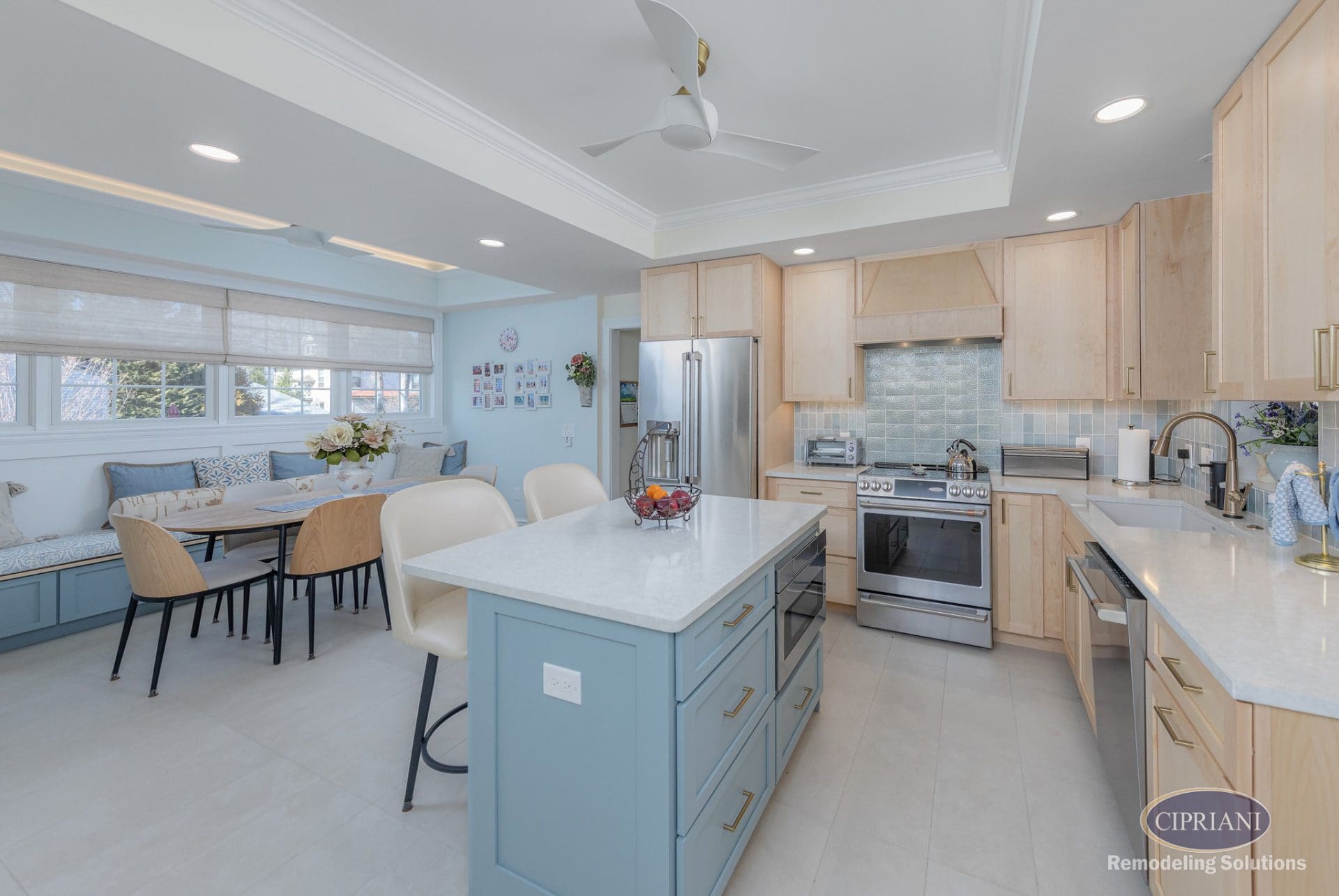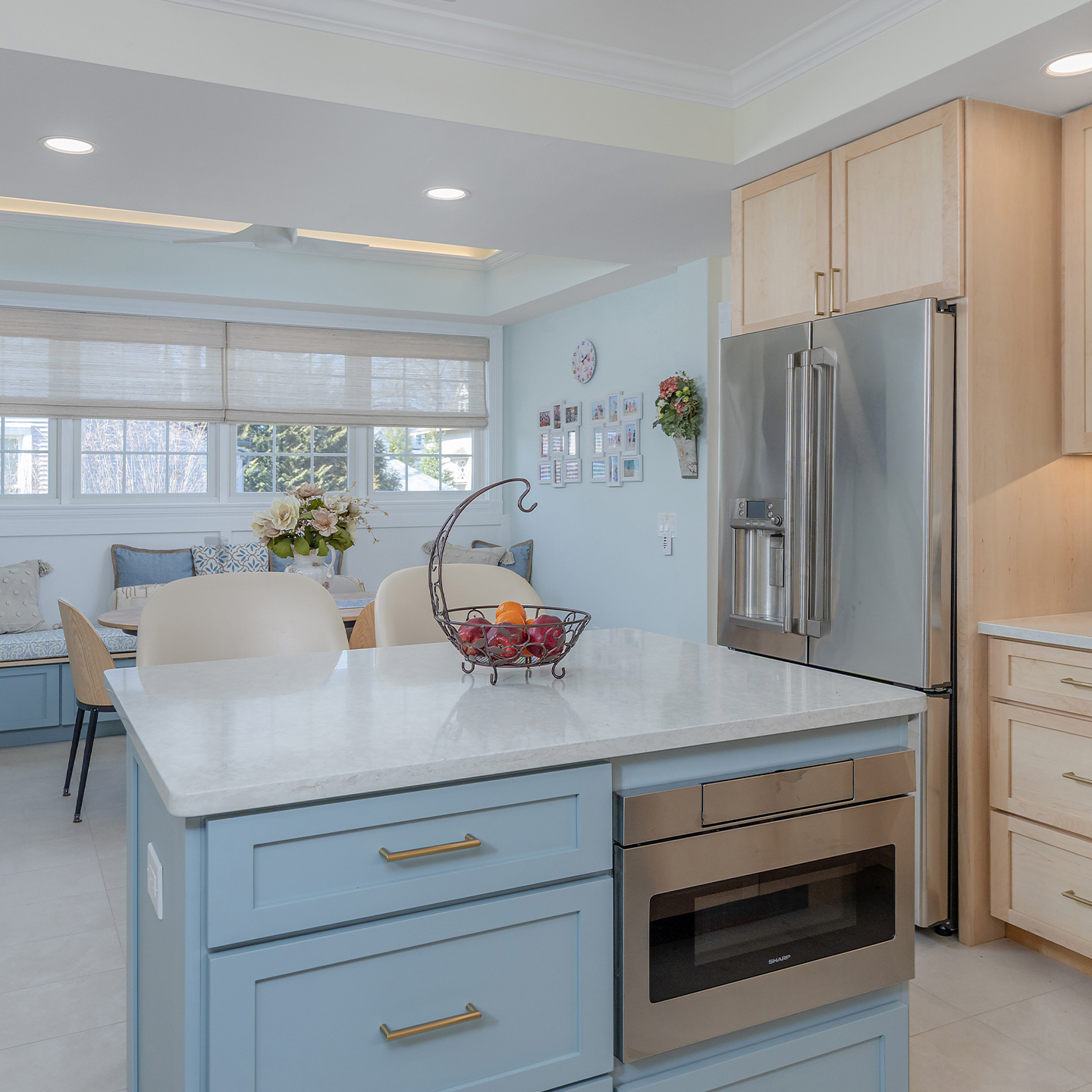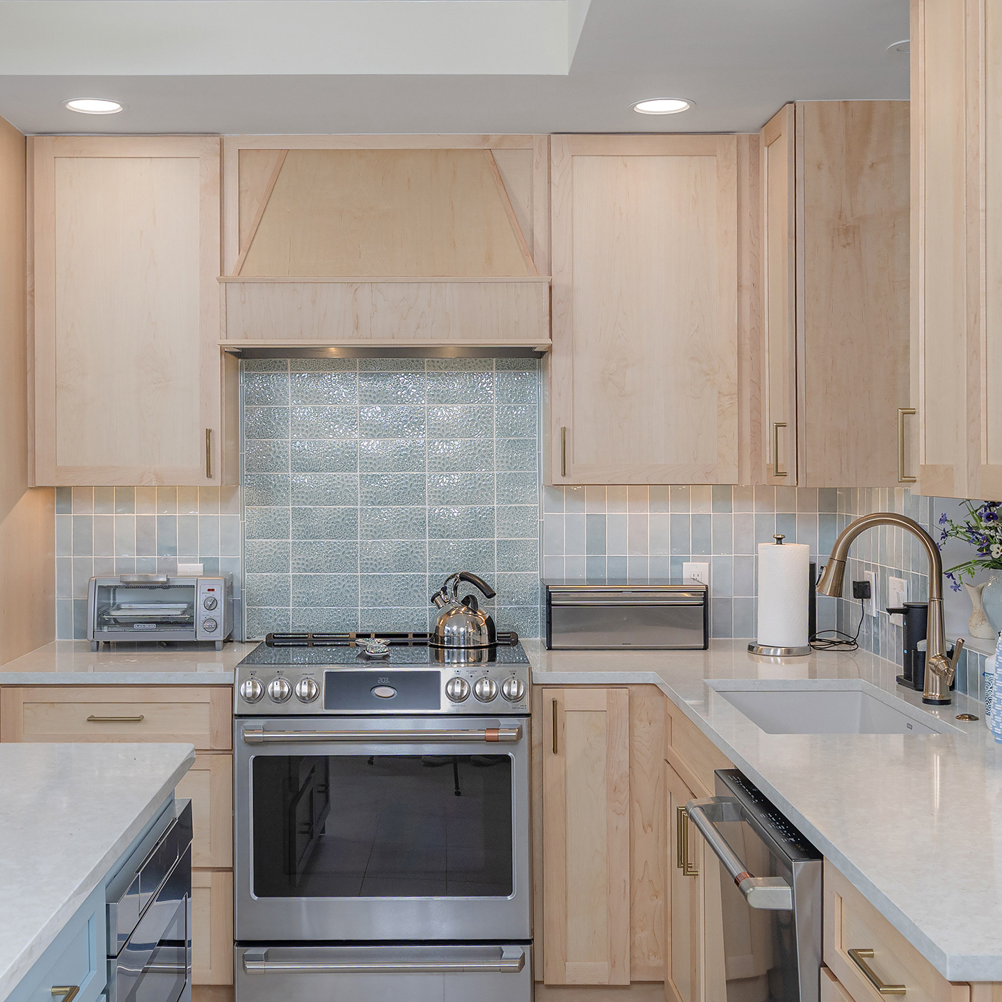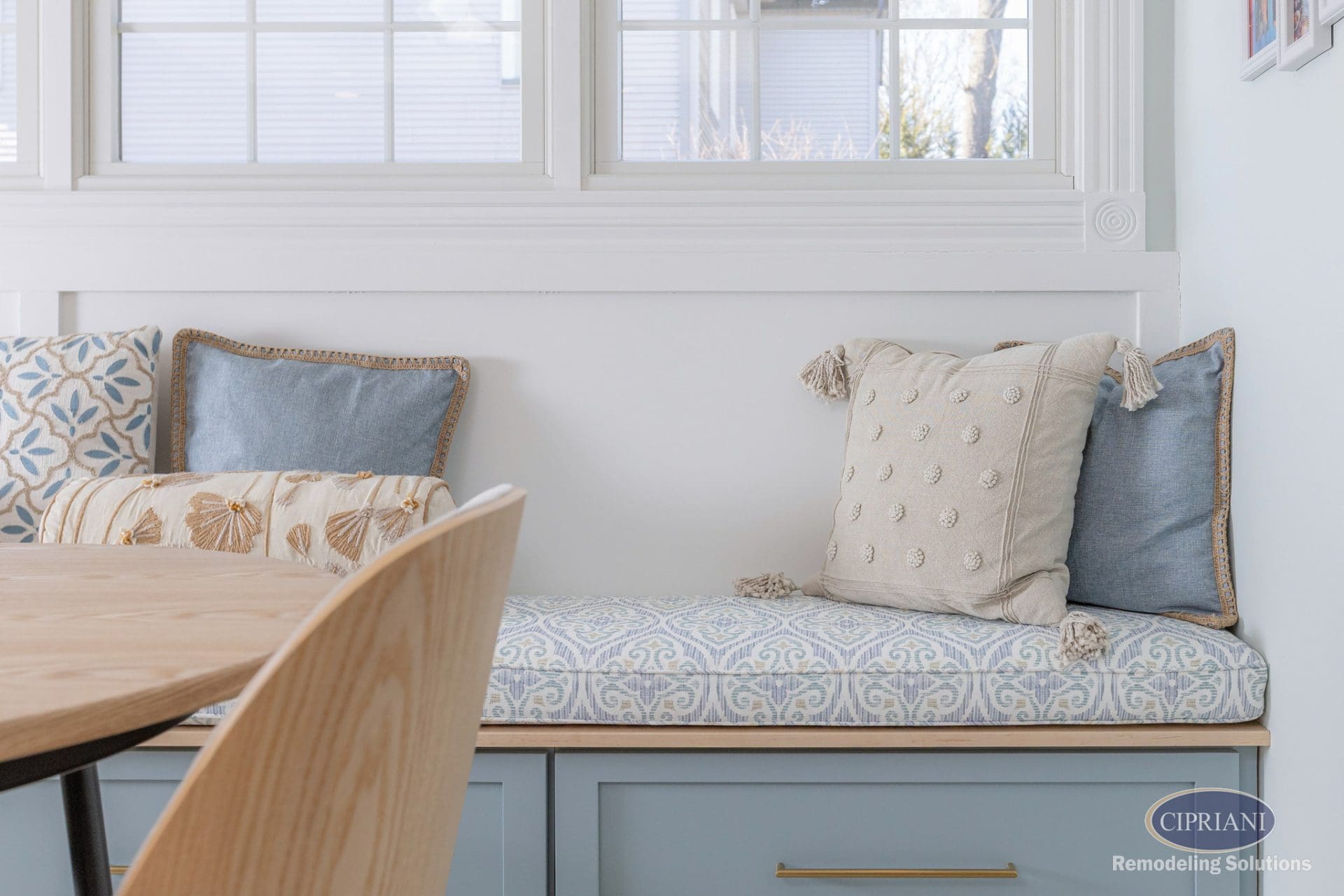 This returning client expanded their home to host family gatherings, adding a spacious dining area with a built-in bench for the grandkids and plenty of natural light. The design balances function and elegance, featuring a multi-tone backsplash, natural wood cabinetry, and gold accents for a refined, cohesive look.