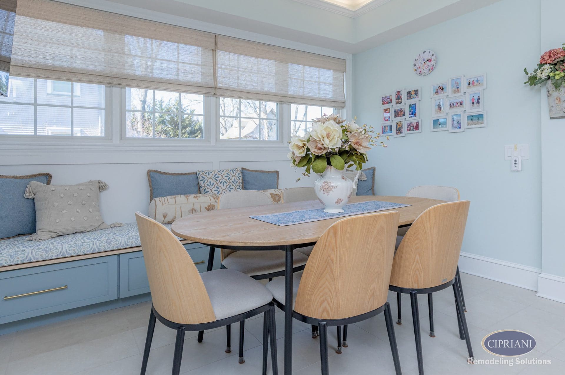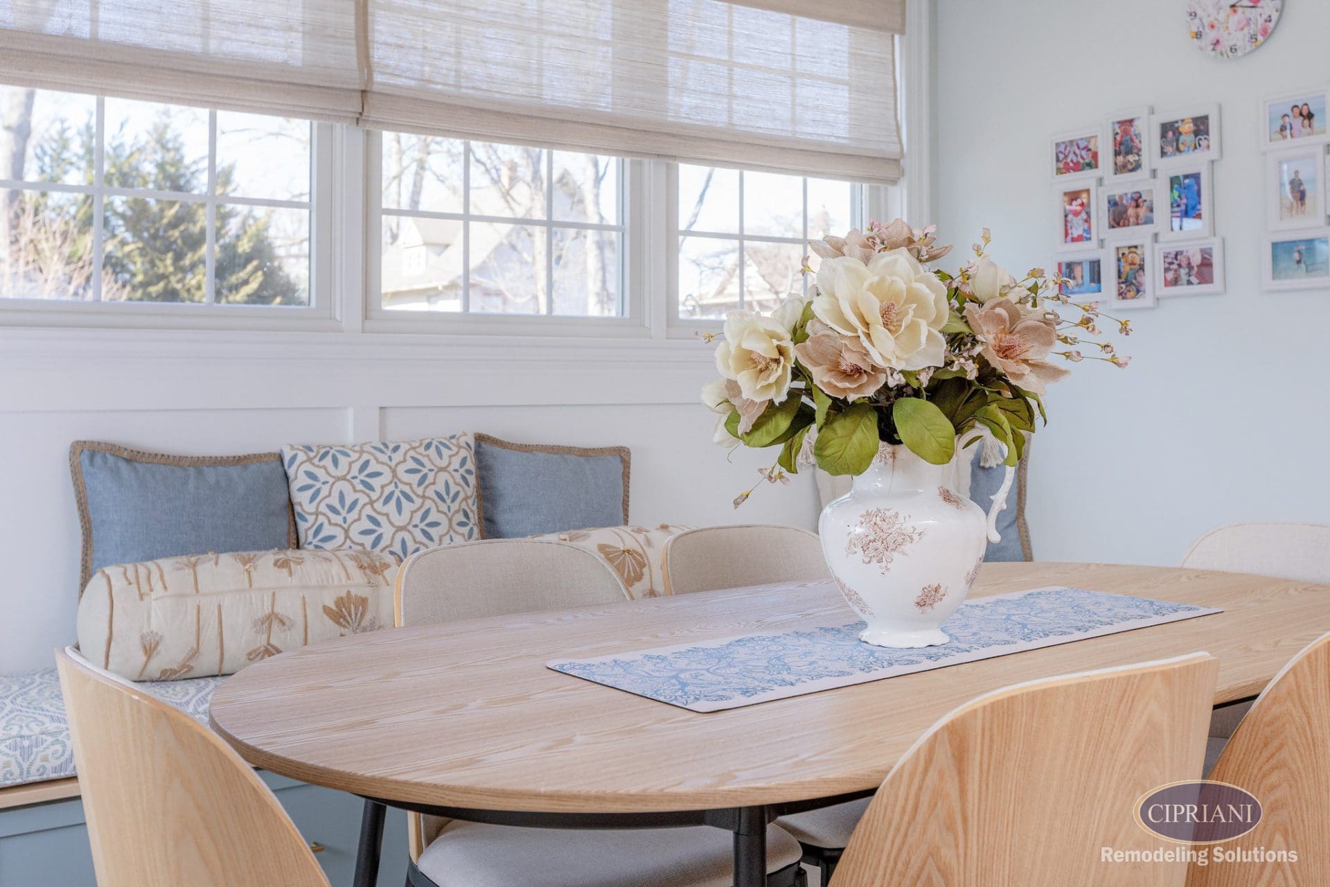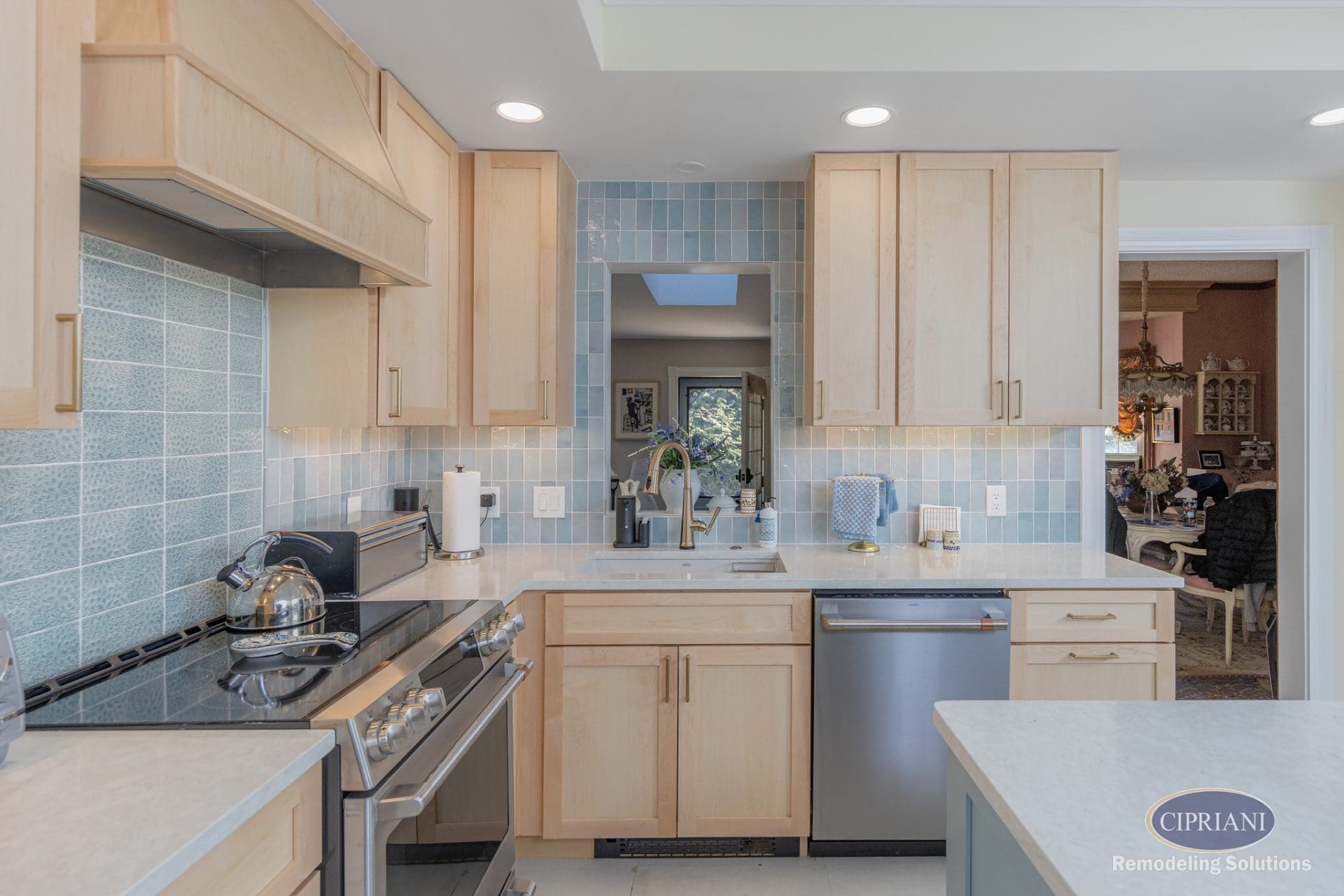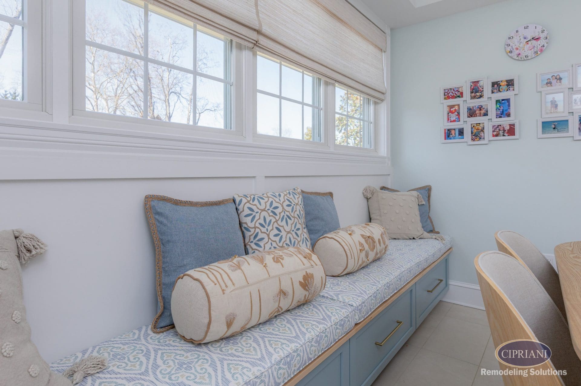 This returning client expanded their home to host family gatherings, adding a spacious dining area with a built-in bench for the grandkids and plenty of natural light. The design balances function and elegance, featuring a multi-tone backsplash, natural wood cabinetry, and gold accents for a refined, cohesive look.