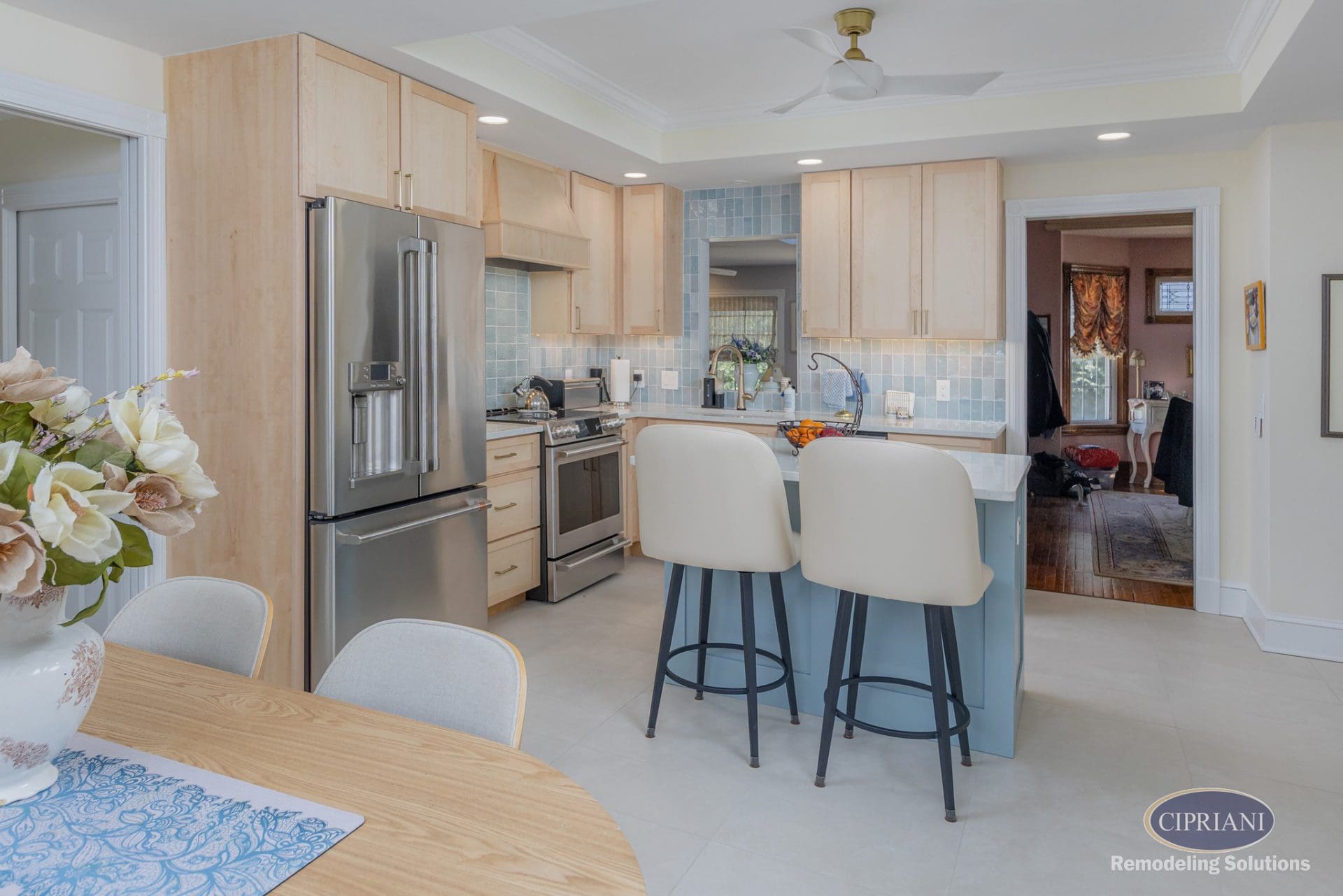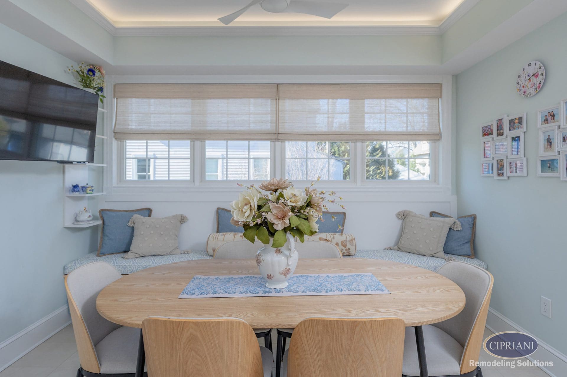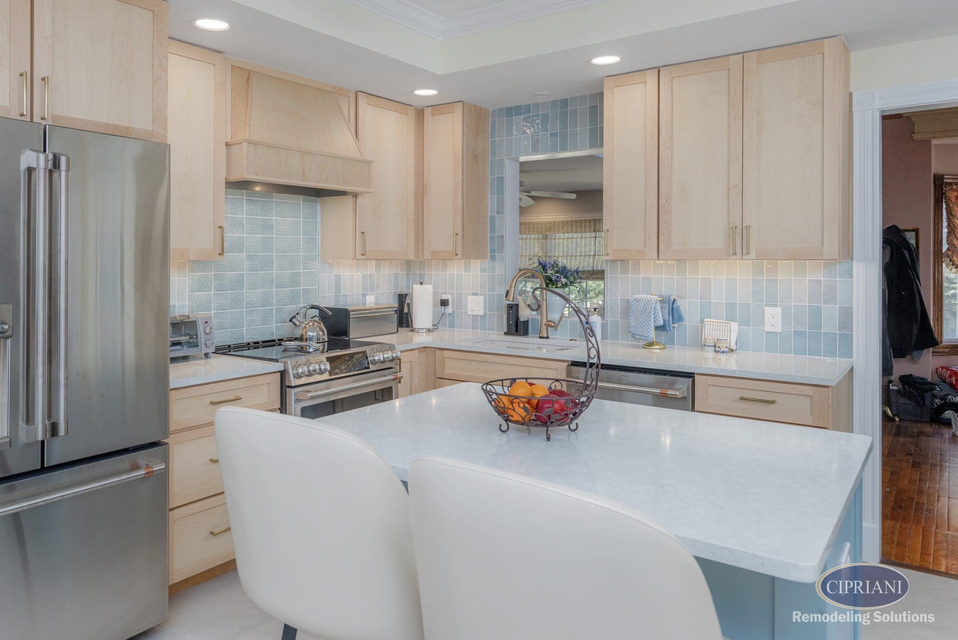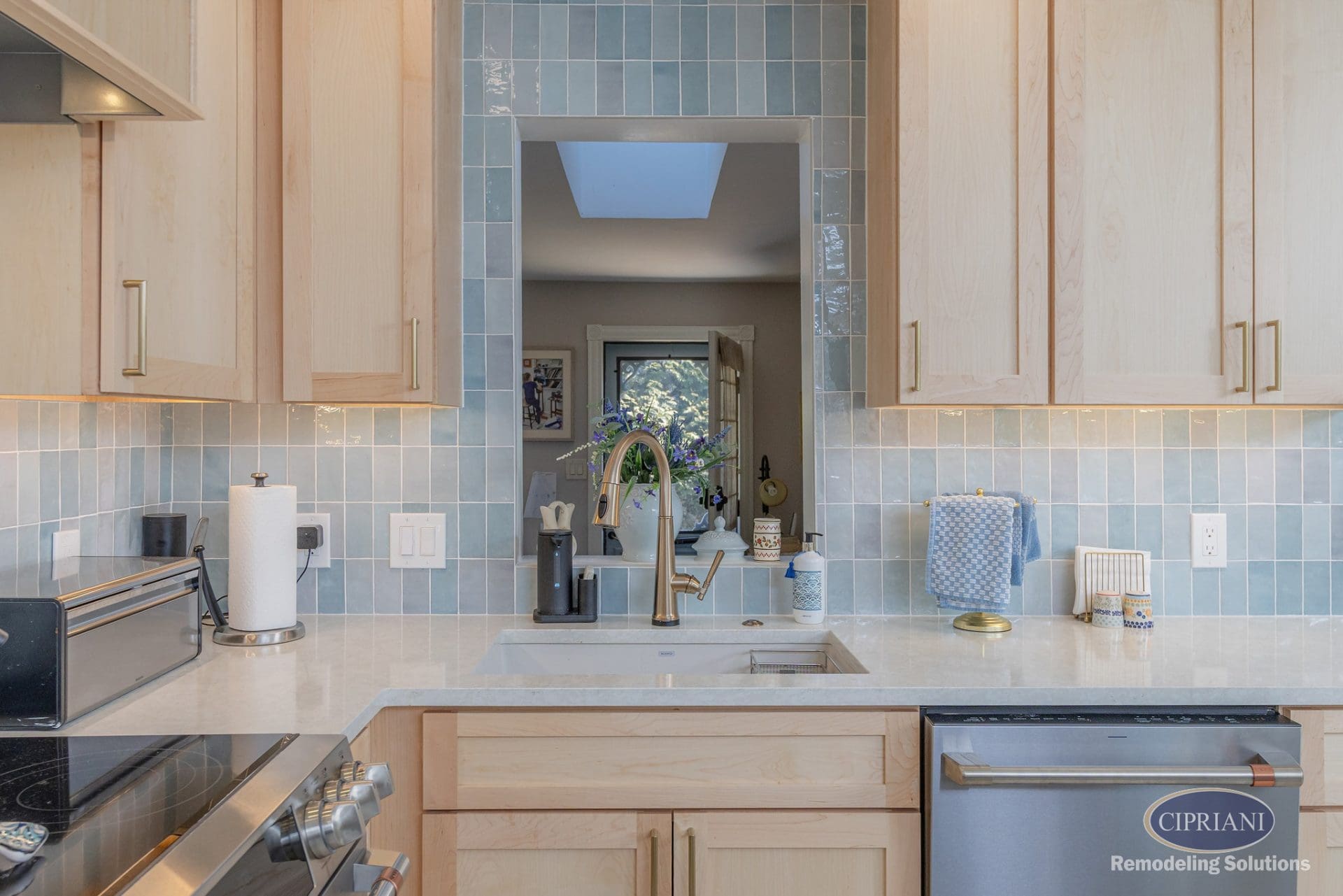 This returning client expanded their home to host family gatherings, adding a spacious dining area with a built-in bench for the grandkids and plenty of natural light. The design balances function and elegance, featuring a multi-tone backsplash, natural wood cabinetry, and gold accents for a refined, cohesive look.