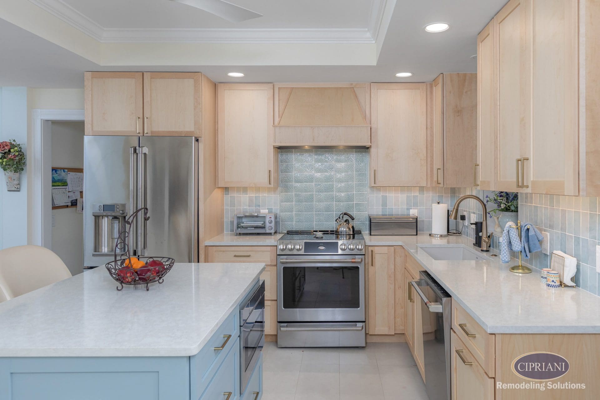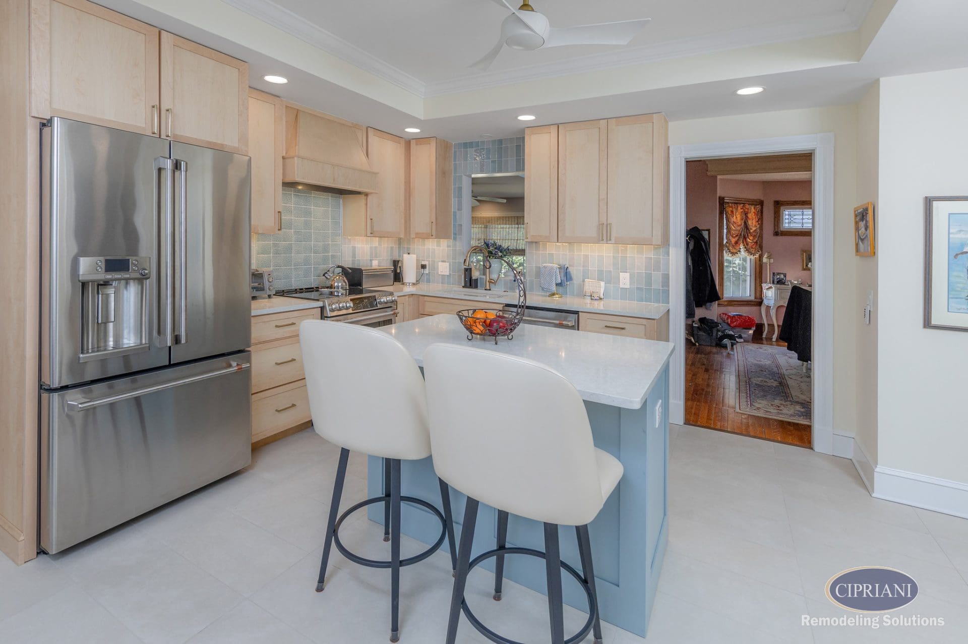 The layout blends comfort and functionality, featuring expanded storage, durable quartz countertops, and easy-care tile flooring. Hidden rope lighting enhances the seating area’s ambiance, while natural wood tones and a bold island accent create visual contrast. A custom backsplash ties the design together, adding a refined touch.