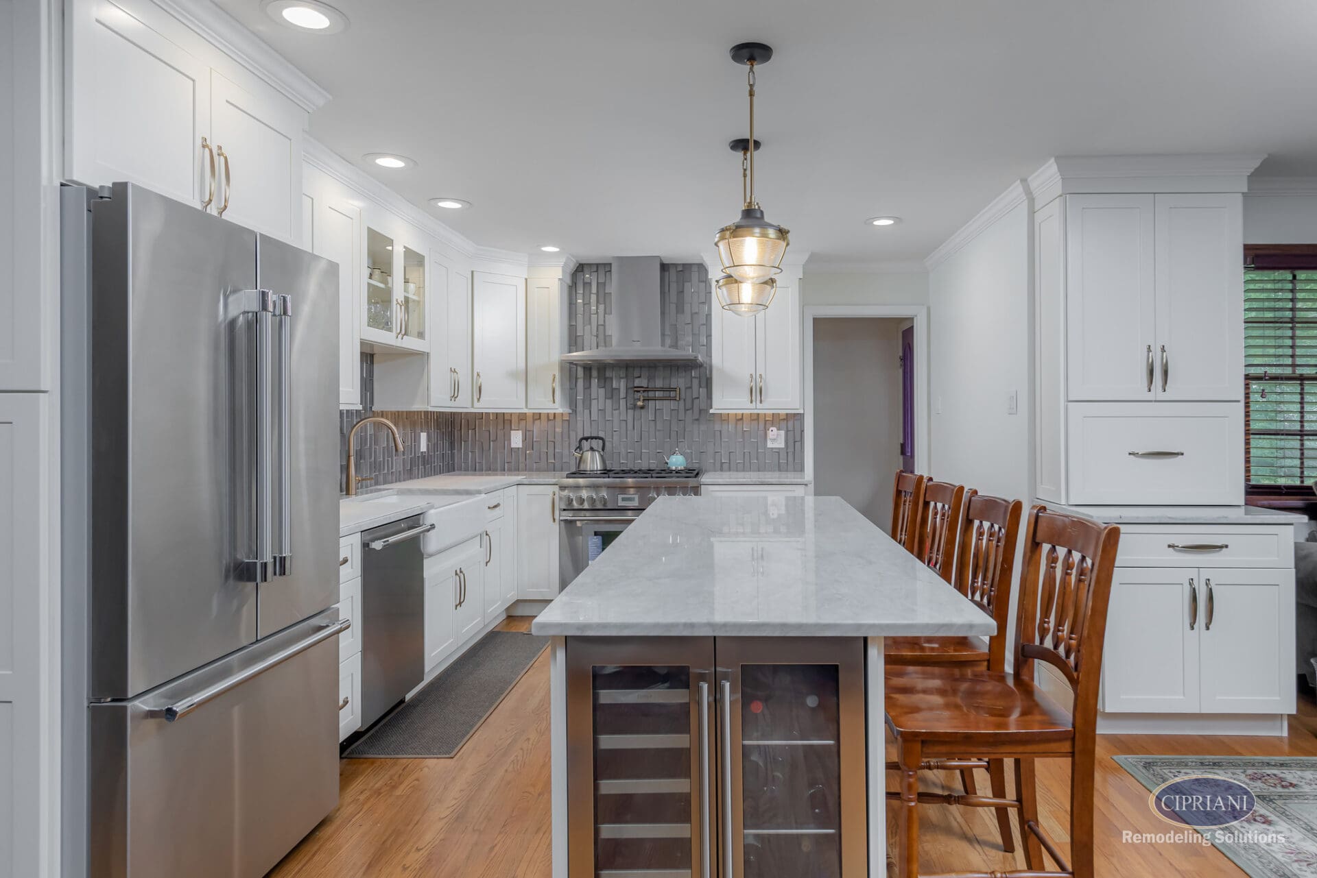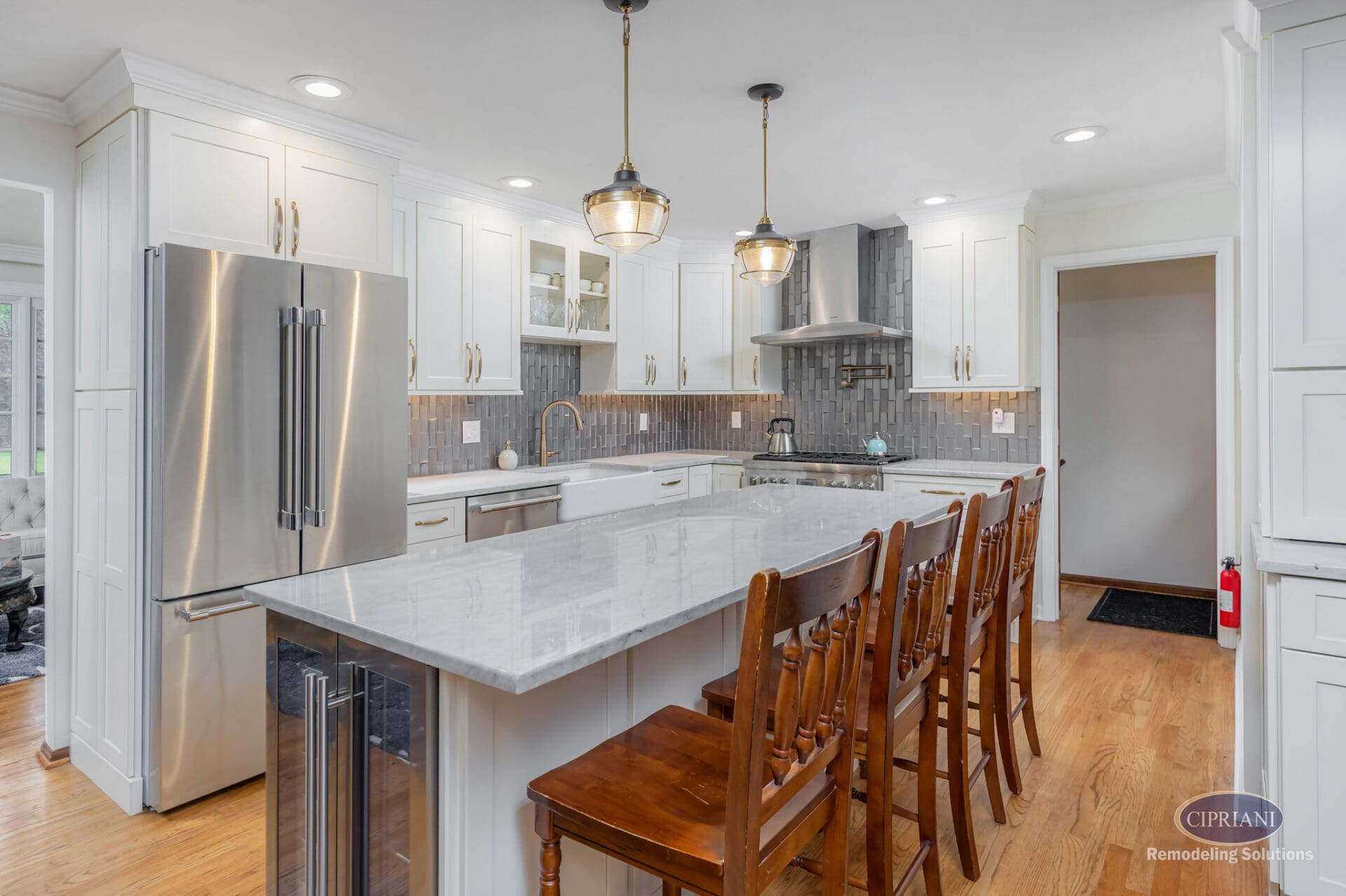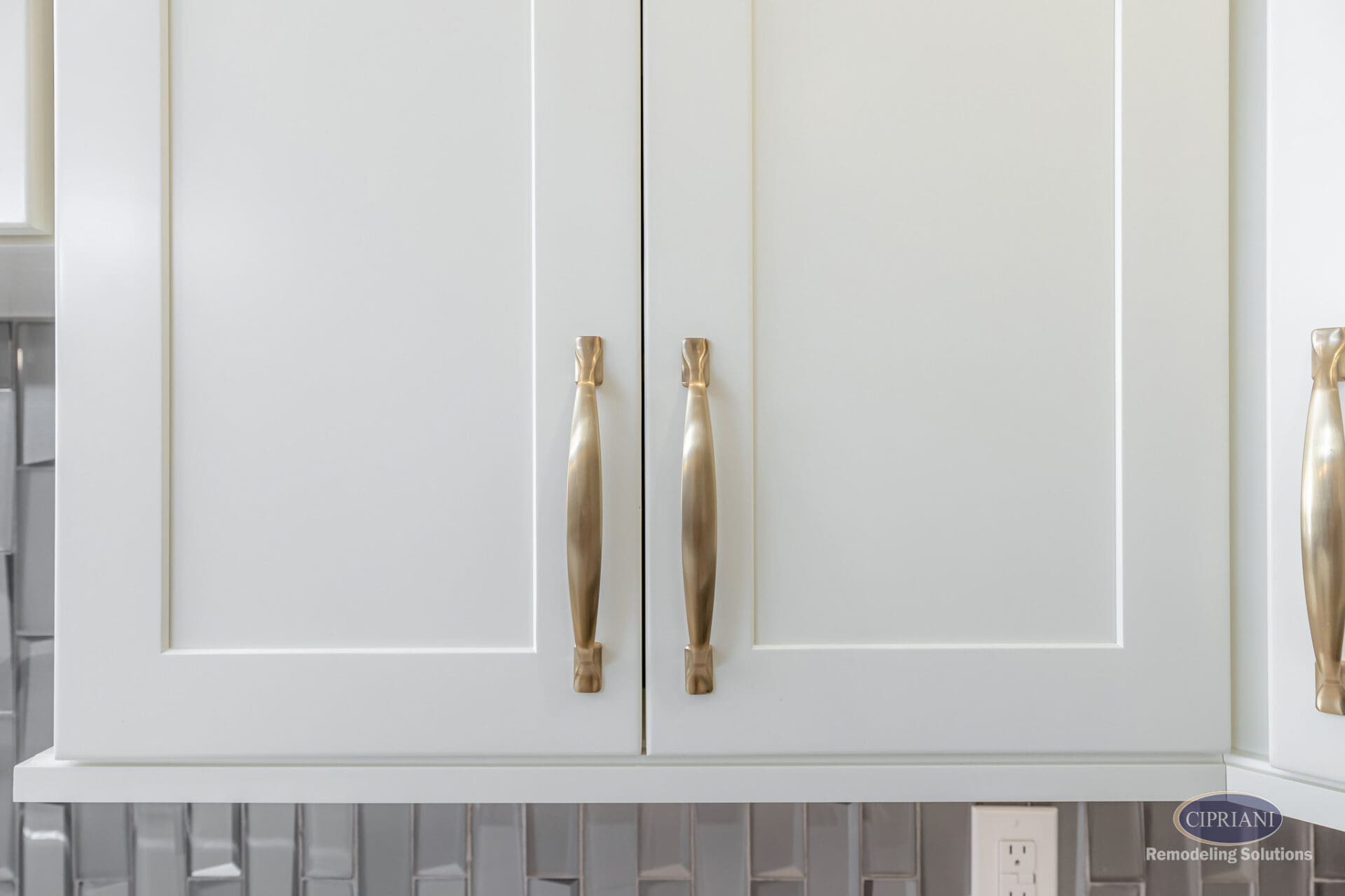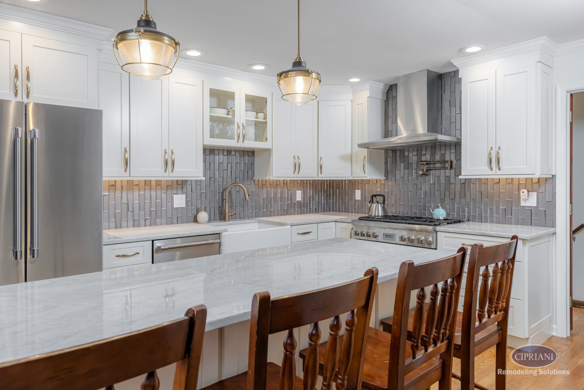 Custom White Shaker Cabinetry – Full-height cabinetry maximizes storage while maintaining a clean, classic look that keeps the kitchen feeling bright and open.