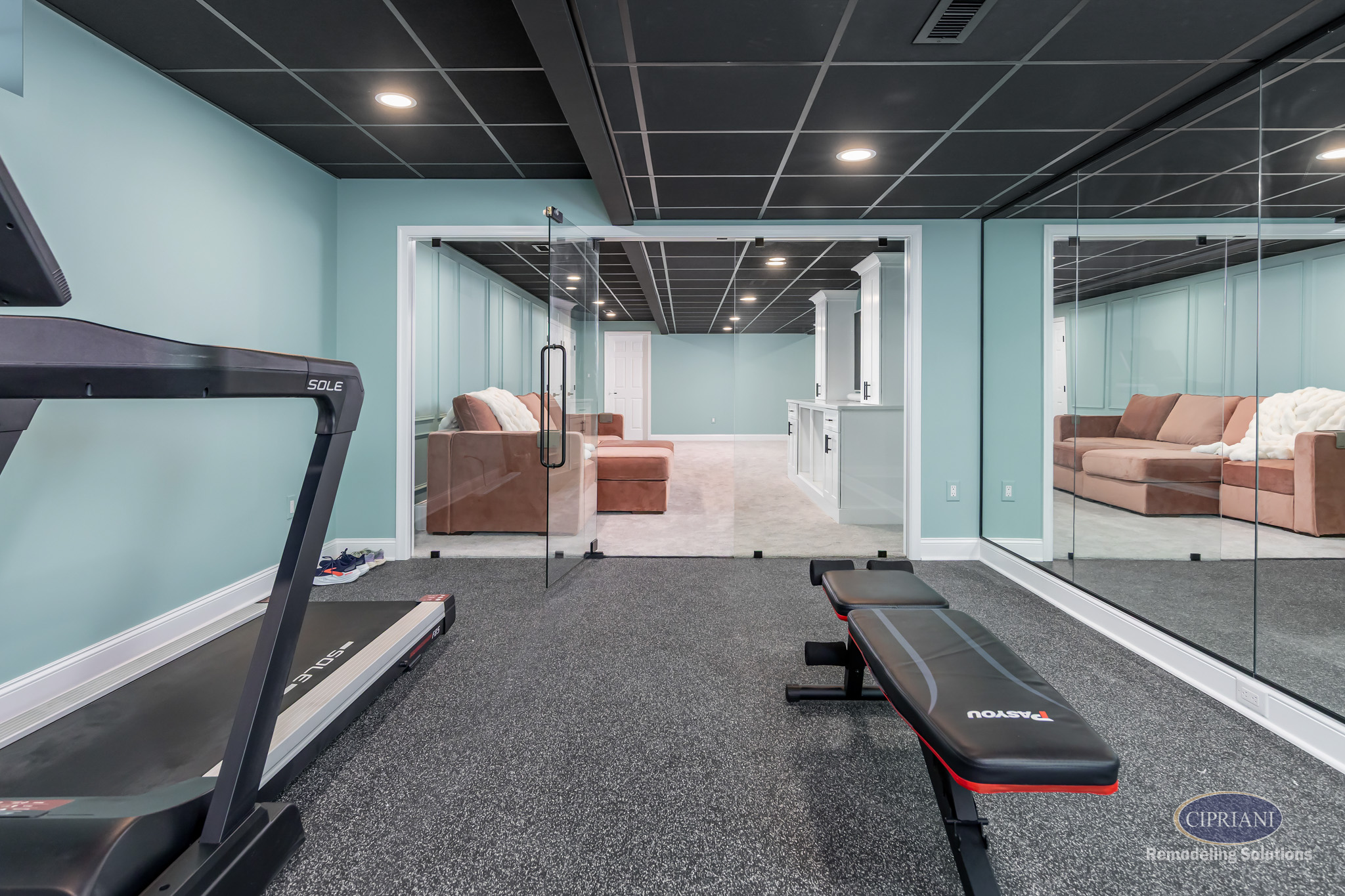 - Glass-Enclosed Home Gym – A dedicated fitness area behind glass doors keeps the basement open while creating a defined workout space.