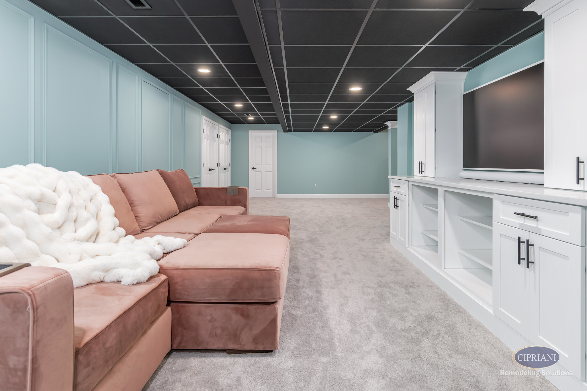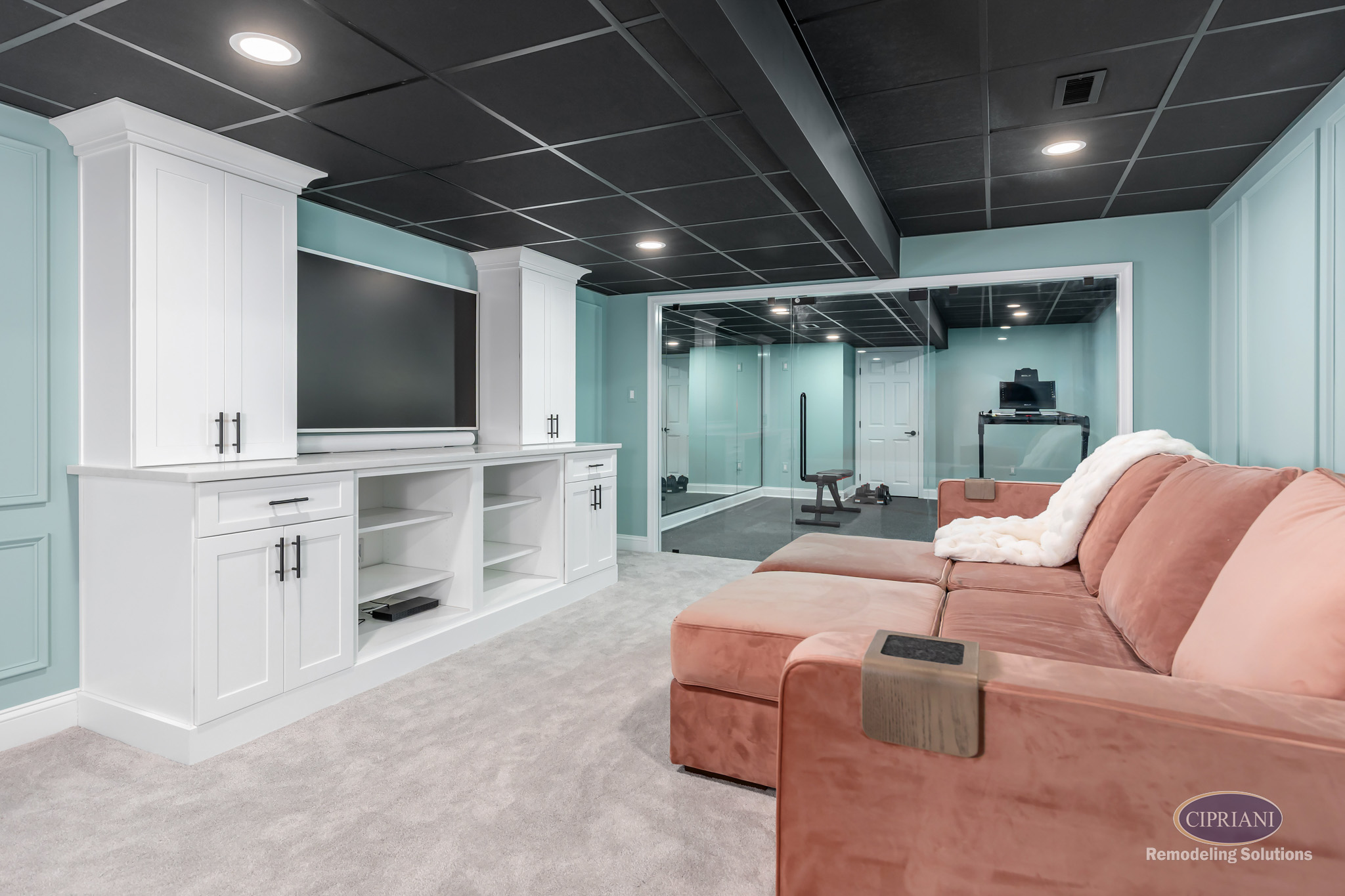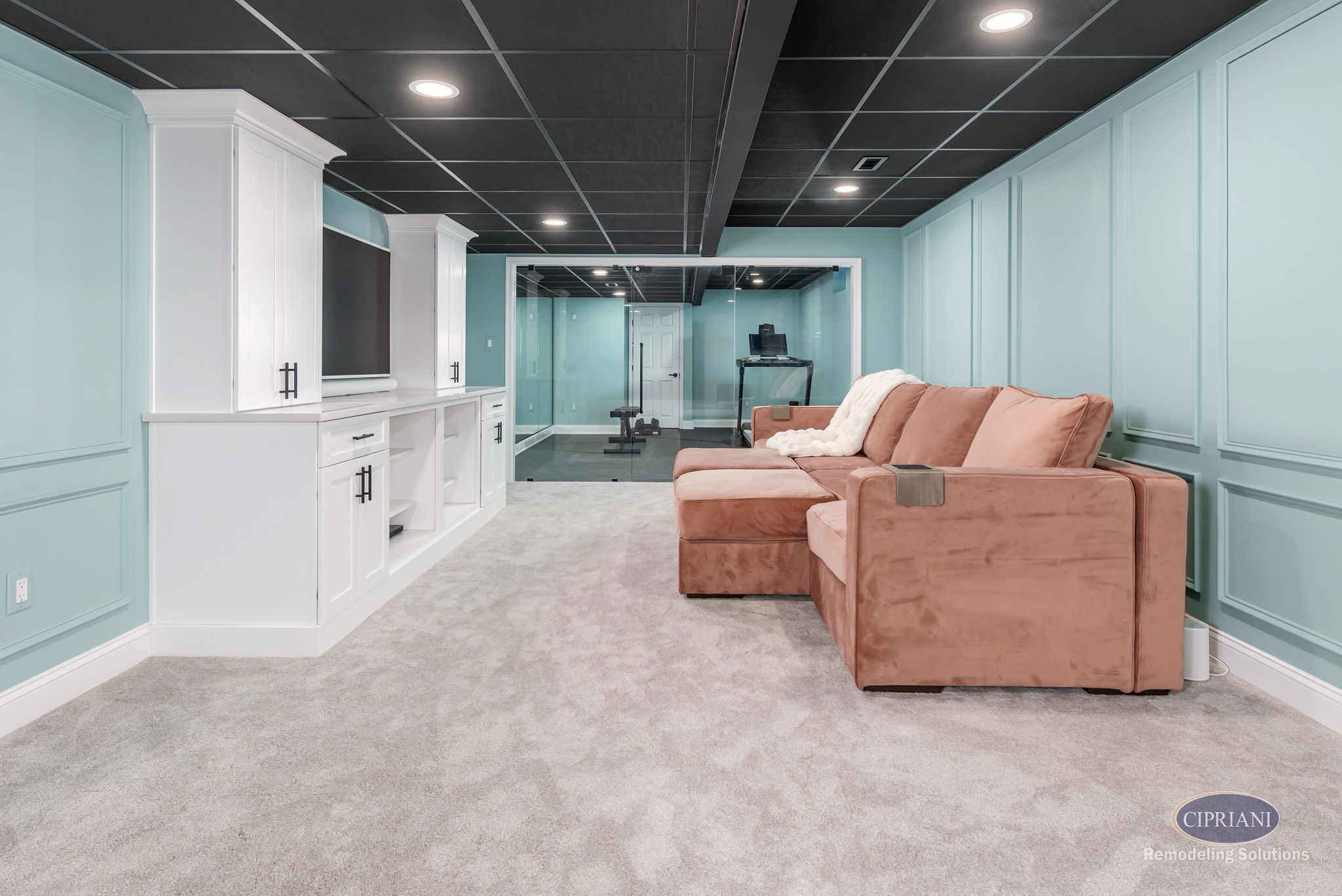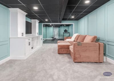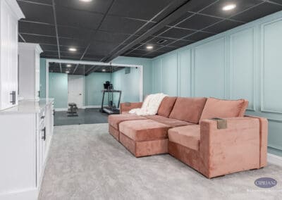 - Decorative Wall Paneling – Soft teal wall molding adds architectural detail and elevates the finished basement with subtle character.